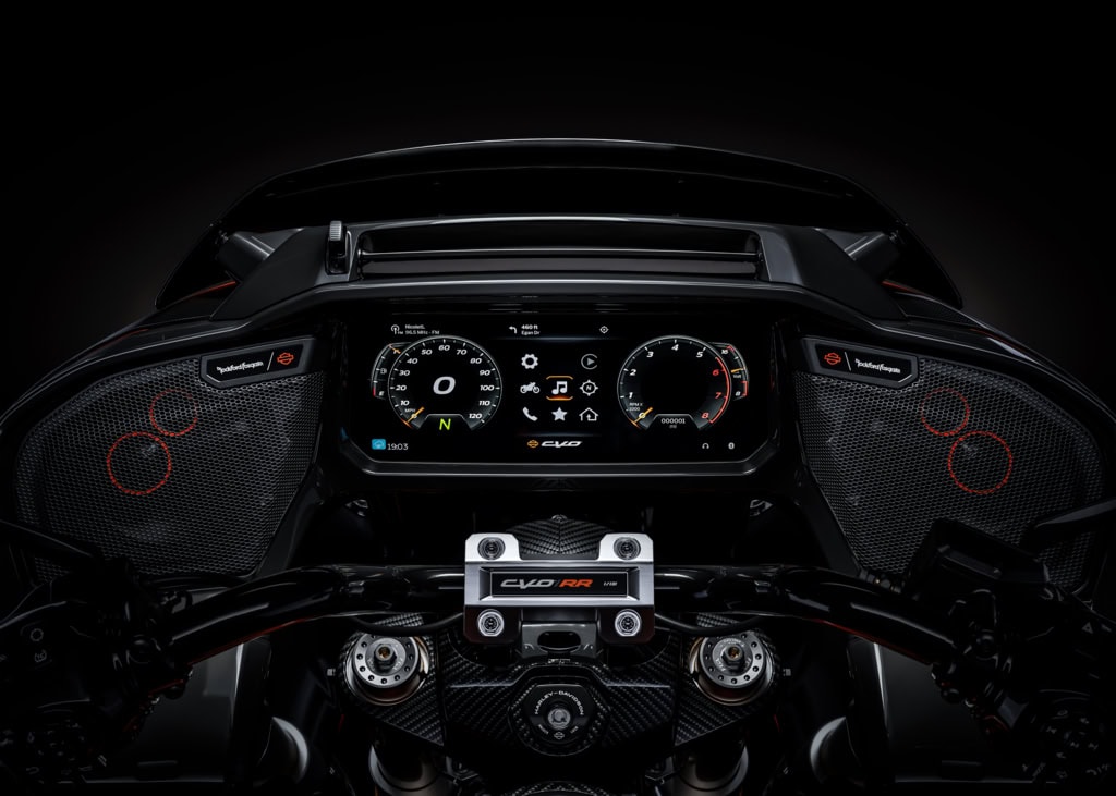 Eén cilinder van deze ‘RR’ meet precies 1.076,5 cc. En daarvan heeft deze CVO er twee. Met andere woorden: deze V-twin van de Harley-Davidson CVO Road Glide RR meet maar liefst 2.153 cc. Maar deze twin is er niet als een zogenaamde ‘crate engine’ om achteraf in te bouwen, maar de hele motorfiets wordt af-fabriek geleverd, inclusief carbon bodywork. Het flink gekietelde Screamin’ Eagle 131-blok, voorzien van een volledig titanium Akrapovic-uitlaatsysteem, is goed voor 204 Nm koppel bij 4.750 toeren en 153 pk bij 5.750 toeren.
