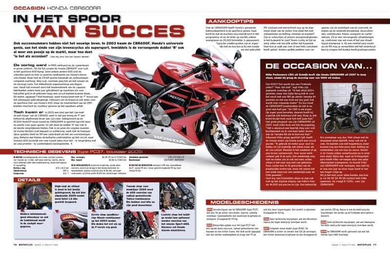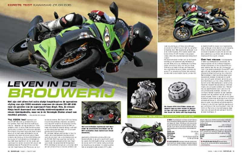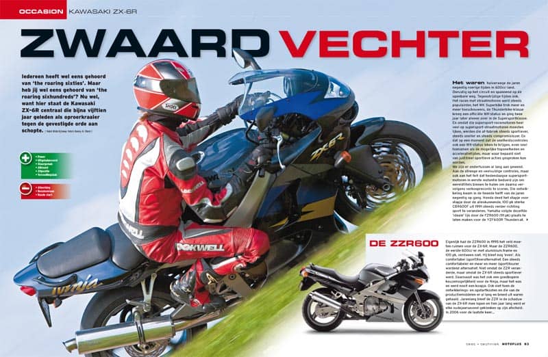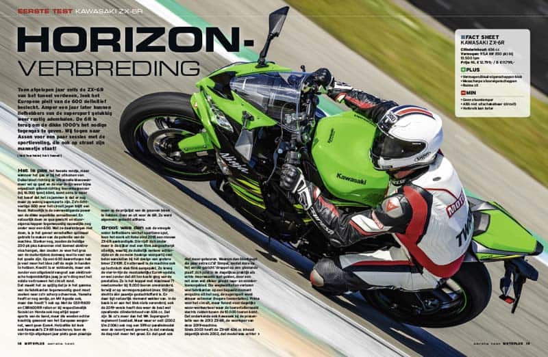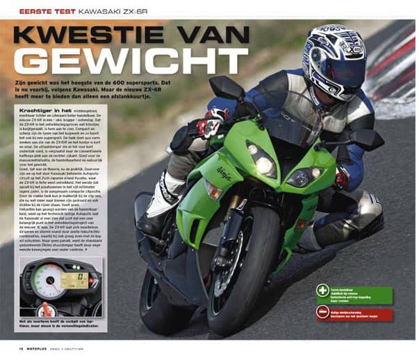 vermogen 88,1 kW (120 pk) bij 13.500 tpm Max. koppel 66 Nm bij 11.250 tpm RIJWIELGEDEELTE aluminium brugframe, upside-down voorvork Ø 41 mm, volledig instelbaar, aluminium swingarm met hevelsysteem, volledig instelbaar, stuurdemper, dubbele schijfrem voor Ø 310 mm, vierzuiger-remklauwen, schijfrem achter Ø 220 mm, enkelzuiger-remklauw. Aluminium gietwielen 3.50 x 17; 5.50 x 17 Banden 120/70ZR17; 180/55ZR17 Banden in test Bridgestone BT015 “E” MATEN EN GEWICHTEN wielbasis 1375 mm, balhoofdhoek 66,5°, naloop 98 mm, veerweg v/a 120/135 mm, zithoogte* 820 mm, rijklaar gewicht volgetankt* 186 kg, max. belading* 178 kg, tankinhoud/reserve 18,0 liter/3,5 liter. Garantie 2 jaar Service-intervallen elke 6000 km Kleuren rood/zwart, blauw/wit, zwart/wit, zwart Prijs NL € 12.190,- / B € 10.900,- INFO Honda Nederland BV, tel. 020-707 0000, www.honda.nl INFO BELGIË Honda Belgium NV, tel. +32 (0)53-725 111, www.honda.be KAWASAKI ZX-6R MOTOR vloeistofgekoelde viercilinder-viertakt lijnmotor, twee bovenliggende ketting aangedreven nokkenassen, vier kleppen per cilinder, klepbediening via stoterbussen, wet-sump smering, benzine-injectie Ø 38 mm, geregelde katalysator, 315 watt dynamo, accu 12V/8 Ah, mechanisch bediende natte meerplaatskoppeling, zesversnellingsbak, O-ring ketting. Boring x slag 67,0 x 42,5 mm Cilinderinhoud 599 cc Compressie 13,3 : 1 Max. vermogen 125 pk bij 14.000 tpm Max. koppel 66 Nm bij 11.700 tpm RIJWIELGEDEELTE aluminium brugframe, upside-down telescoopvork Ø 41 mm, volledig instelbaar, aluminium swingarm met hevelsysteem, volledig instelbaar, dubbele schijfrem voor Ø 300 mm, vierzuiger-remklauwen, schijfrem achter Ø 210, enkelzuiger-remklauw.