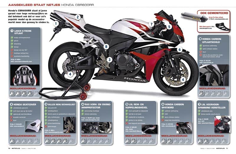 [[bildunterschrifte]] [Unterschrift Honda] HONDA CBR600RR Nuchter en zakelijk instrumentenpaneel en de lichte en efficiënte uitlaat onder de buddyseat. De achterkant van het frame, uitlaat en stelmotor van de uitlaatklep zijn alle drie onbeschermd tegen opspattend vuil van het achterwiel (midden). Erg fraai: de flitsende swingarm in GP-stijl. [Unterschrift Kawasaki] KAWASAKI ZX-6R Opvallende witte toerenteller met het rode bereik dat pas begint bij 16.500 tpm. Vanaf nu met versnellingsindicator. De driehoekige uitlaat-eindpijpjes zijn ook opvallend. Erg goedkoop doet de foeilelijke kroonmoer met splitpen aan (midden). De swingarm is daarentegen een waar kunstwerk. [Unterschrift bei Suzuki] SUZUKI GSX-R600 Oog voor detail, de rode R van de GSX. Links de karakteristieke korte einddemper met schitterende sound, in het midden laat Suzuki zien hoe je een frame beschermd tegen water en vuil.