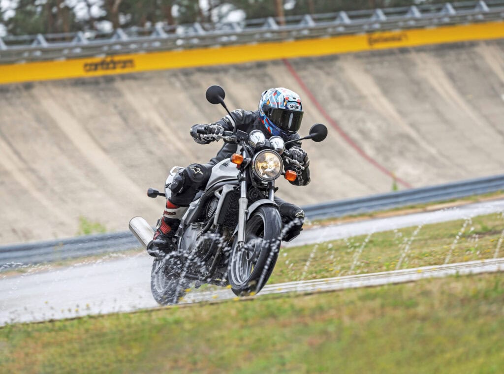 Youngtimers als de Kawasaki ER-5 vragen daarentegen nog ouderwets ‘handwerk’ en bij het idee van een paniekstop in de regen gaan bij velen de nekharen al overeind staan. In al onze bandentesten zien we elke keer weer wezenlijke verschillen in de afgelegde afstand bij de remproef vanaf 100 km/uur. De rijders van de echte oude motoren zonder ABS (in de jaren negentig verscheen het antiblokkeersysteem pas hier en daar, voornamelijk op een paar BMW’s en Honda’s) zouden dus extra waarde moeten hechten aan goede natte grip, zelfs als ze zelden in de regen rijden (je komt er af en toe toch in terecht, tenslotte). Bij de genoemde remproef op nat wegdek zien we daarom een verschil in de testprocedures van de youngtimer-banden en de retrobanden. Met de van ABS voorziene Triumph Bonneville 1200 hebben we de gebruikelijke remproef vanaf 100 km/uur uitgevoerd, waarbij de uitkomst was dat er tussen de beste en slechtste band meer dan vijf meter verschil in remweg zit. Maar hoe te werk gaan met motoren zonder ABS? We hebben van deze remproef op nat wegdek afgezien, enerzijds omdat het te riskant is en anderzijds omdat de resultaten niet goed reproduceerbaar zouden zijn. Daarom hebben we het gehouden bij een combinatie van de datarecording en rondetijdmetingen op het natte testparcours en de subjectieve indrukken van de testrijders. Deze drie ‘kanalen’ leveren genoeg informatie om een goed beeld te krijgen van de beschikbare natte grip van de vijf sets testbanden. De felbegeerde gouden flipper op dit regenonderdeel gaat uiteindelijk naar de band die nauwkeurig stuurt, een duidelijk gevoel geeft over de beschikbare grip en die een breed grensgebied heeft, zodat je duidelijk wordt gewaarschuwd dat je aan het eind van de grip aan het raken bent. Dan is rijden in de regen niet eng meer.