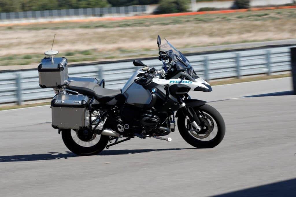 Een van de hoogtepunten van het bezoek aan dit BMW-testcentrum was echter een zelfrijdende BMW R1200GS Adventure! Een testrijder kwam aanrijden met de GS waarvan uiterlijk alleen een aantal camera’s en sensoren, een grote GPS-antenne op de topkoffer en een extra ‘jiffystand’ rechts opvielen. De testrijder stopte, stapte af en hield de GS nog even vast, waarna de machine uit zichzelf verder reed. Een idioot gezicht waarbij de BMW-technici zeer geamuseerd de verbijsterde reacties van de toeschouwers zaten te bekijken. Ik maakte ter plekke al de grap: “Ideaal zo’n zelfrijdende BMW voor als je een dagje zou gaan toeren met vrienden en het blijkt te regenen. Dan blijf je zelf lekker thuis op de bank zitten en laat je alleen je motor meegaan!”