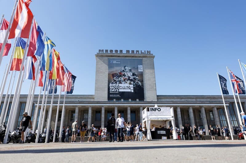 De aankomst bij de statige Messe Berlin is indrukwekkend, en dat geldt ook voor de torenhoge entreehal, waarin verschillende exotische BMW-specials de aandacht trekken. Binnen in de karakteristieke Messe is er een tentoonstelling van alle nieuwe modellen, maar ook prachtige klassiekers in een speciale hoek gewijd aan 100 jaar BMW. In een tweede hal staan diverse accessoiresfabrikanten als bijvoorbeeld Wunderlich, Akrapovic en protectorenspecialist Ortema, maar ook een foto-expositie van BMW-onderdelen. Ook worden er gratis proefritten georganiseerd op een groot aantal nieuwe BMW-modellen, en dat zijn bepaald geen korte ritjes. Ik had mijn zinnen gezet op een paar modellen, maar dat bleek iets te ambitieus. Mijn testrit met een F900R in een mooi compact groepje van vier voert over een fraaie route buiten de stad en we zijn zomaar anderhalf uur onderweg! Leuk, maar aangezien ik maar één dag heb, stort ik me daarna op de rest van het evenement. Want ook buiten is er veel te zien…