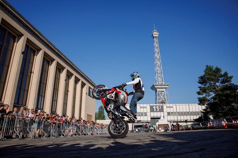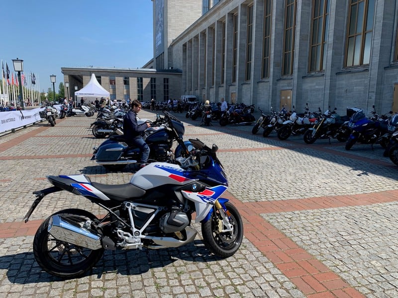 De aankomst bij de statige Messe Berlin is indrukwekkend, en dat geldt ook voor de torenhoge entreehal, waarin verschillende exotische BMW-specials de aandacht trekken. Binnen in de karakteristieke Messe is er een tentoonstelling van alle nieuwe modellen, maar ook prachtige klassiekers in een speciale hoek gewijd aan 100 jaar BMW. In een tweede hal staan diverse accessoiresfabrikanten als bijvoorbeeld Wunderlich, Akrapovic en protectorenspecialist Ortema, maar ook een foto-expositie van BMW-onderdelen. Ook worden er gratis proefritten georganiseerd op een groot aantal nieuwe BMW-modellen, en dat zijn bepaald geen korte ritjes. Ik had mijn zinnen gezet op een paar modellen, maar dat bleek iets te ambitieus. Mijn testrit met een F900R in een mooi compact groepje van vier voert over een fraaie route buiten de stad en we zijn zomaar anderhalf uur onderweg! Leuk, maar aangezien ik maar één dag heb, stort ik me daarna op de rest van het evenement. Want ook buiten is er veel te zien…