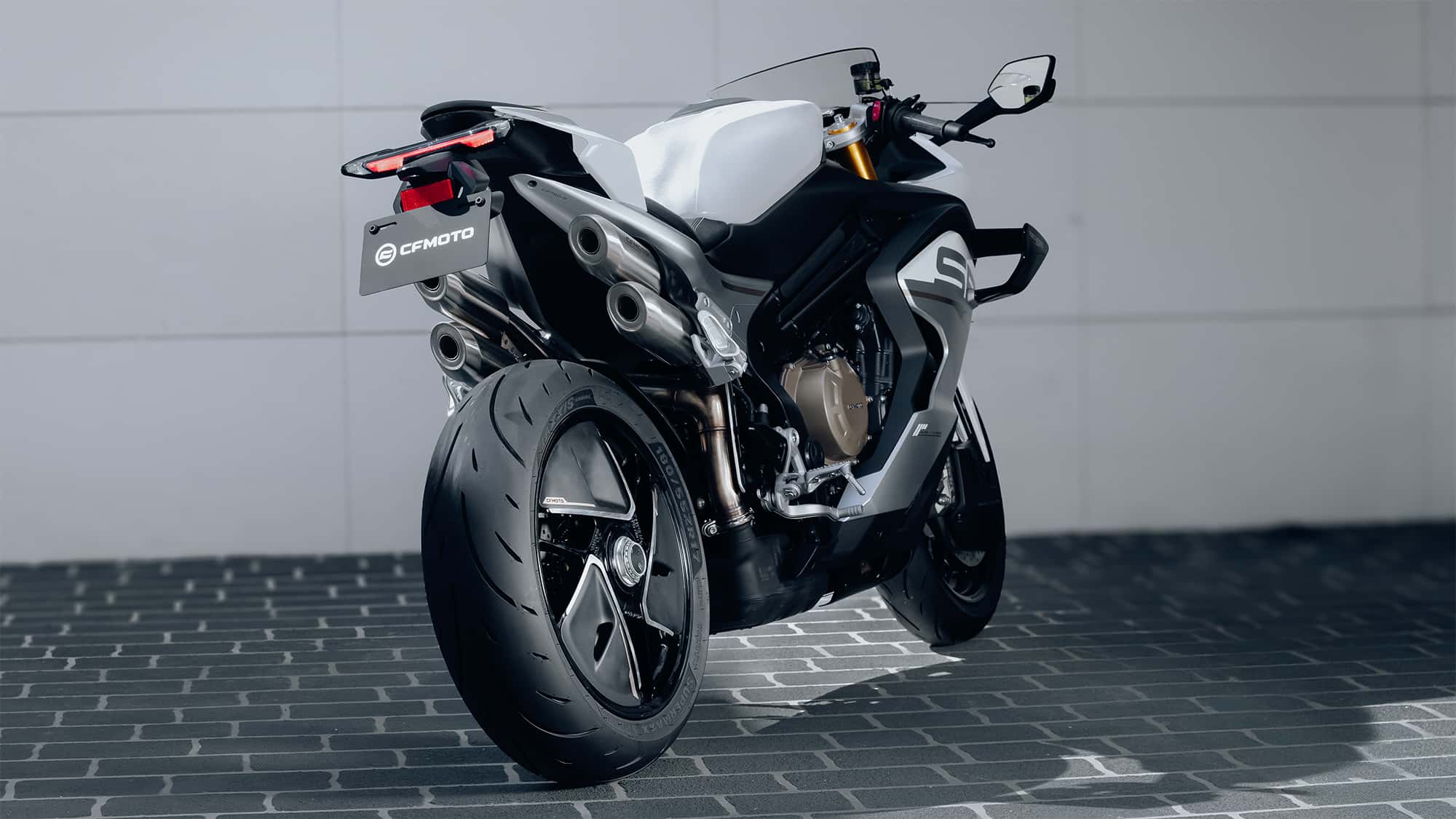 Deze nieuwe sportmachine was al officieel geregistreerd in China, maar lijkt dus ook op redelijk korte termijn naar Europa te komen. Dat deze 750 SR-S is voorzien van een viercilinder, maakt duidelijk dat CFMoto dit project trekt zonder technisch partner KTM. De van een volledig stroomlijn voorziene 750 zou een topsnelheid van meer dan 230 km/uur halen en daarbij dankzij het ram-air luchtinlaatsysteem een paar extra pk’s winnen. Het naar achteren omhoog lopende 4-in-4-uitlaatsysteem oogt minstens net zo snel.