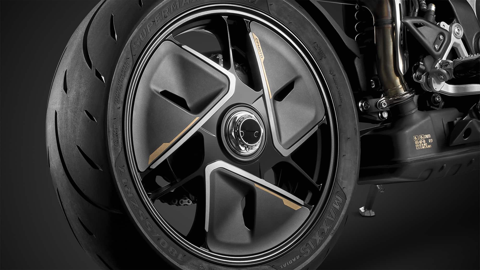 De banden van de CFMoto 750 SR-S hebben standaard maten in dit segment: 120/70 ZR17 voor en 180/55 ZR17 achter (eerste montage: Maxxis SP). De wielbasis is met 1.419 millimeter relatief kort. Dit is waarschijnlijk bedoeld om de handling te vergemakkelijken, want met 213 kilo (inclusief 17 liter brandstof in de tank) is deze sportieve 750 een relatief zware motorfiets. Andere belangrijke gegevens zijn de balhoofdhoek van 65,5 graden en de zithoogte van 805 millimeter.
