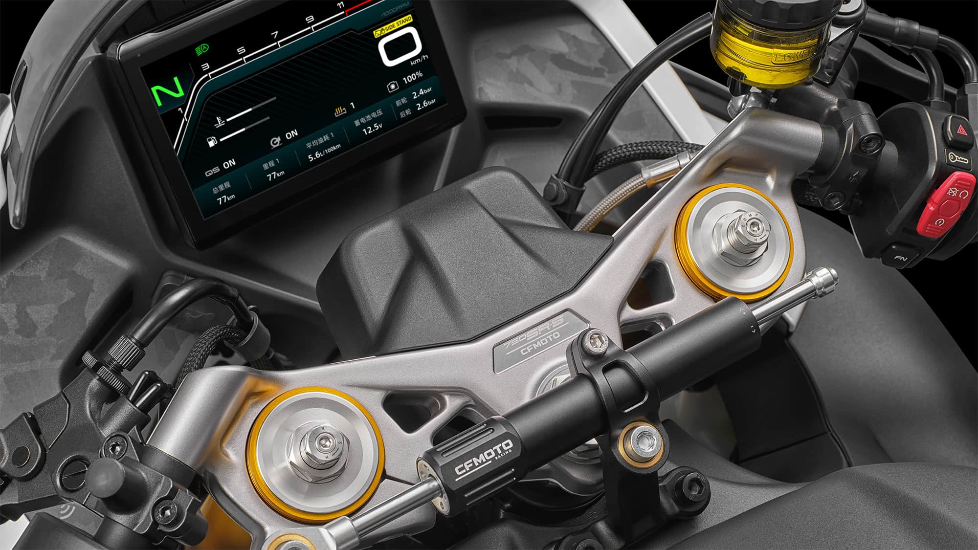 Met een groot 6,2 inch TFT-kleurendisplay en connectiviteitsfuncties is de CFMoto 750 SR-S helemaal bij de tijd. Bovendien is hij uitgerust met ABS en tractiecontrole, beide hellingshoekgevoelig. Andere uitrustingsdetails zijn de quickshifter (helaas alleen om op te schakelen), bandenspanningssensoren en een keyless-systeem inclusief smartphone-app.