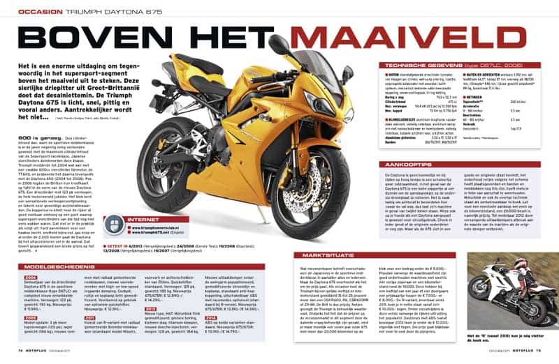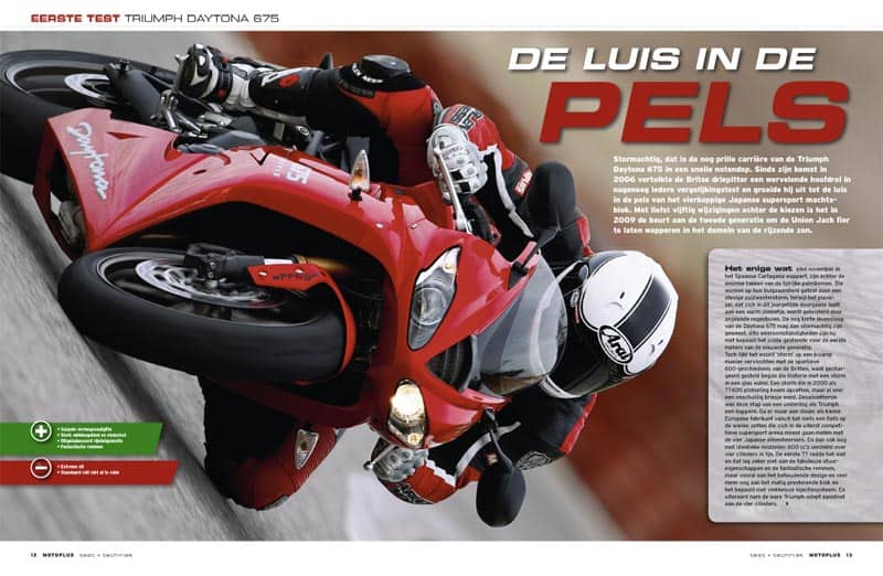 Wat er in de jaren daarna ook op de markt verscheen, alles was in zekere zin wel een beetje schatplichtig aan deze motorfiets van de eeuw. Of juist heel veel, zoals de motoren in deze test. Maar dat is niet iets waarvoor ze zich hoeven te schamen.TECHNISCHE GEGEVENSDUCATI 1098MOTOR vloeistofgekoelde 90°-V-twin, boring x slag 104,0 x 64,7 mm, 1099 cc. RIJWIELGEDEELTE stalen vakwerkframe, upside-down voorvork, enkelzijdige swingarm, dubbele schijfrem voor Ø 330 mm, schijfrem achter Ø 245 mm. MATEN EN GEWICHTEN wielbasis 1430 mm, balhoofdhoek 65,5°, volgetankt gewicht* 201 kg. PRIJS NL € 19.799,- / B € 17.199,-. TRIUMPH DAYTONA 675MOTOR vloeistofgekoelde driecilinder lijnmotor, boring x slag 74,0 mm x 52,3 mm, 675 cc. RIJWIELGEDEELTE aluminium brugframe, upside-down voorvork, aluminium swingarm, dubbele schijfrem voor Ø 308 mm, schijfrem achter Ø 220 mm. MATEN EN GEWICHTEN wielbasis 1392 mm, balhoofdhoek 66,5 °, volgetankt gewicht* 190 kg. PRIJS NL € 11.990,- / B € 10.590,-.