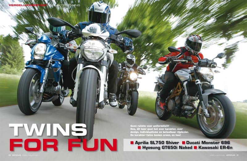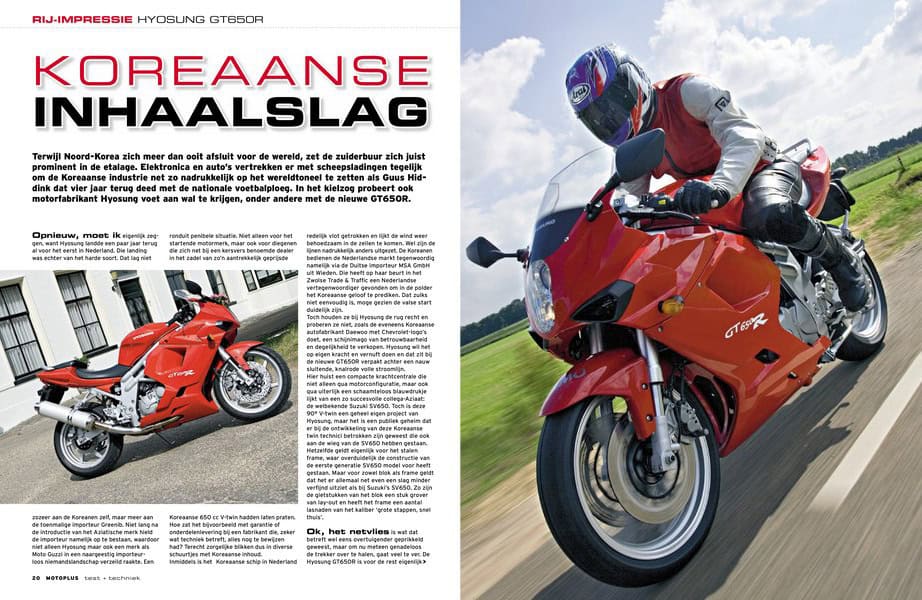 Toch komt er, terugkijkend op onze eerste kennismaking met de GT650i nieuwe stijl, een tweeledig gevoel bovendrijven. Net als voorheen hebben de Koreanen met de GT een meer dan volwaardige motorfiets in huis voor een meer dan schappelijke prijs. Een motor ook die dankzij diverse kleine ingrepen duidelijk volwassener is geworden. Stukje bij beetje wordt de Aziaat beter en beter. Maar toch weet Hyosung nog altijd niet het niveau van de Japanners te evenaren. Maar wat niet is, kan natuurlijk nog komen!________________________________________[KASTEN TECHNISCHE DATEN]HYOSUNG GT650i NakedMOTOR vloeistofgekoelde tweecilinder viertakt 90° V-motor, twee bovenliggende ketting aangedreven nokkenassen en vier kleppen per cilinder, klepbediening via stoterbussen, wet-sump smering, benzine-injectie Ø 39 mm, geregelde katalysator, 350 watt dynamo, accu 12V/12Ah, mechanisch bediende natte meerplaatskoppeling, zesversnellingsbak, O-ring ketting.Boring x slag 81,5 x 62,0 mmCilinderinhoud 647 ccCompressie 11,6 : 1Max. vermogen 60,0 kW (82 pk) bij 9.250 tpmMax. koppel 67 Nm bij 7.250 tpmRIJWIELGEDEELTE stalen brugframe, upside-down voorvork Ø 41 mm, in- en uitgaande demping instelbaar, stalen swingarm met monoschokbreker en hevelsysteem, veervoorspanning instelbaar, dubbele schijfrem voor Ø 300 mm, vierzuiger remklauwen, schijfrem achter Ø 230 mm, dubbelzuiger remklauw.Aluminium gietwielen 3.00 x 17; 4.50 x 17Bandenmaat 120/60ZR17; 160/60ZR17Banden in test Bridgestone BT-056 “J”MATEN EN GEWICHTEN wielbasis 1.435 mm, balhoofdhoek 64,5º, naloop 85 mm, veerweg v/a 120/120 mm, zithoogte* 810 mm, rijklaar gewicht volgetankt* 212 kg, max. belading* 188 kg, tankinhoud/reserve 17,0/2,5 liter.Garantie twee jaarService-intervallen elke 6.000 kmKleuren witPrijs NL € ,- / B € ,-INFO NEDERLAND Hyosung Motors Nederland, tel. 038-453 3222, www.hyosung-motors.nl INFO BELGIË Fesial n.v., tel.