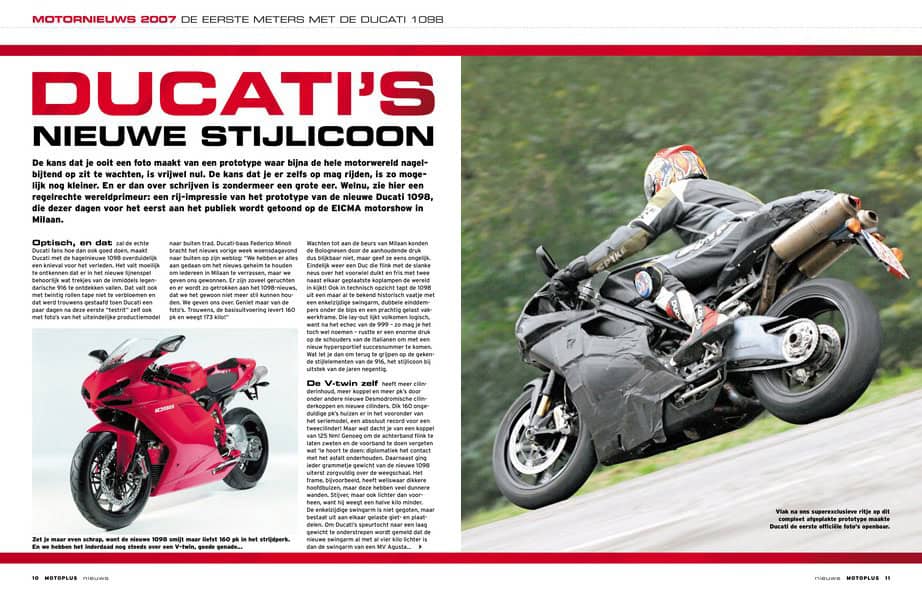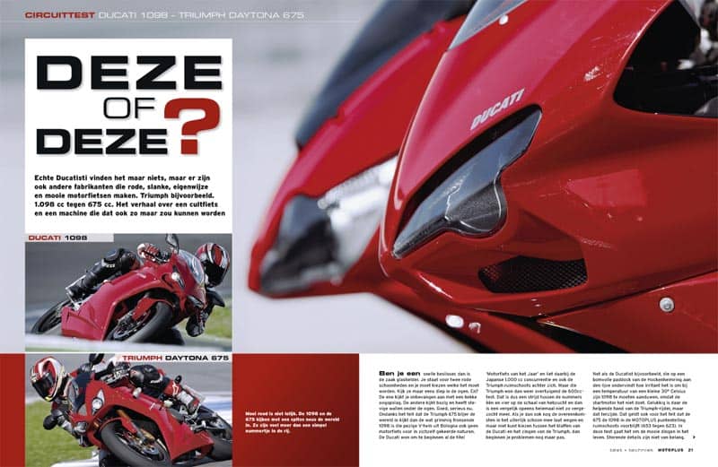 Ducati 1098 – Honda Fireblade – Kawasaki ZX-10R – Suzuki GSX-R1000 – Yamaha R1Het 1000 cc supersportsegment tekent voor meer power dan ooit tevoren. Ducati treedt aan met de 1098, de sterkste in serie gebouwde V-twin aller tijden, en Suzuki en Yamaha markeren de grens voor het hoogste pk-rendement ooit. Maar is dat wel voldoende? Is kracht het enige dat telt? Het maakt totaal niet uit hoe hoog de prestatielat ligt. Op de één of andere manier bedenken de technici altijd weer een vernieuwd recept om hun topatleten – ondanks de immer strenger wordende regels met betrekking tot emissie-eisen en geluidsproductie – van een extra scheut vermogen te voorzien. Natuurlijk, stilstand is achteruitgang en daarom legt ook de nieuwste generatie 1000 cc supersports de lat weer een stukje hoger. Met toerentallen die tot voor enkele jaren terug alleen aan 600 cc’s waren voorbehouden knabbelt een deel van de superliga al aan de 180 pk grens. En het meest fascinerende hieraan is nog wel dat het hele krachthonk zich, zelfs na een koude januarinacht, met een argeloze druk op de knop spontaan tot leven laat wekken en zich in een hoge versnelling braaf door het landschap laat leiden. Gaat het echter tijdens een weekendtripje richting het circuit, dan laten ze zich net zo makkelijk aansporen tot het neerzetten van fabuleuze toptijden. Stil, schoon en met onberispelijke draai-eigenschappen. En dat geldt voor zowel de twee- als de viercilinders, al heeft die eerste het in de afgelopen jaren behoorlijk moeilijk gekregen. DUCATI 1098 – STERKSTE TWIN OOIT Waarom? Omdat zelfs de meest volumineuze twin de pk-wedloop niet meer helemaal kan bijbenen.