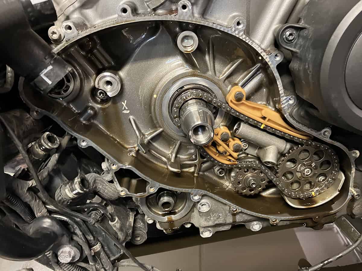 Ondanks alle onheilspellende voortekenen verkeert de 1.252cc-tweecilinder na 50.000 kilometer echter in uitstekende staat. Sommige onderdelen lijken wel nieuw, nog afgezien van de derde koppeling, die pas 11.000 kilometer gelopen had. Maar de krukas en drijfstangen, de cilinderkoppen, nokkenassen, lagers en nokkenaskettingen plus hun geleiders blijken amper onder de indruk van de 50.000 kilometers. Met name de krukas met zijn bijzondere 30 graden verzette kruktappen, om samen met de blokhoek van 60 graden een 90°-V-twin te simuleren, blijkt nog binnen de inbouwmaten. In principe geldt dat ook voor het kleppenmechanisme met de hydraulische klepstellers en rolslepers, en ook voor de nokkenassen en hun lagers. Maar dan slechts bíjna: één uitlaatklepzitting en één inlaatklepsteel zitten buiten de slijtagelimiet, maar zonder dat het resulteerde in lekkage of overmatige kantelspeling.