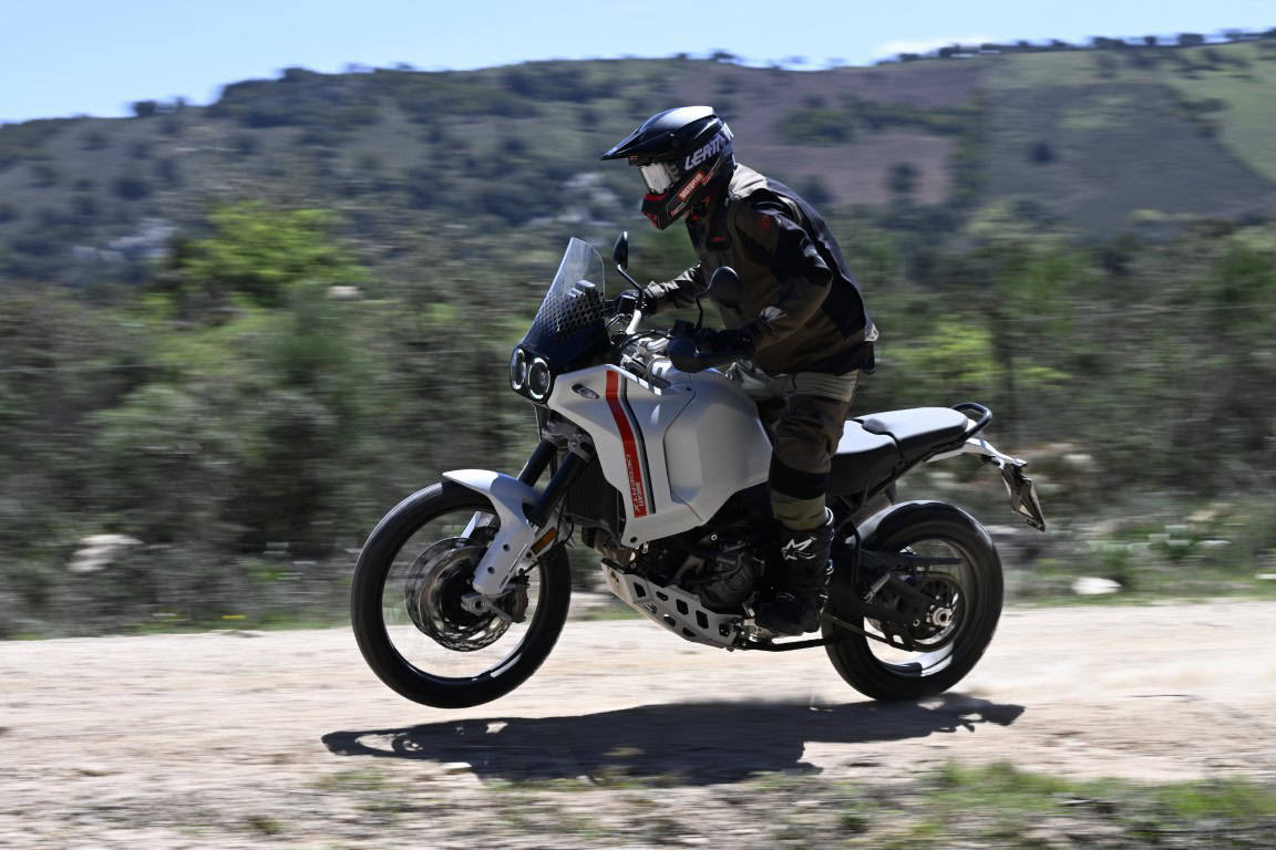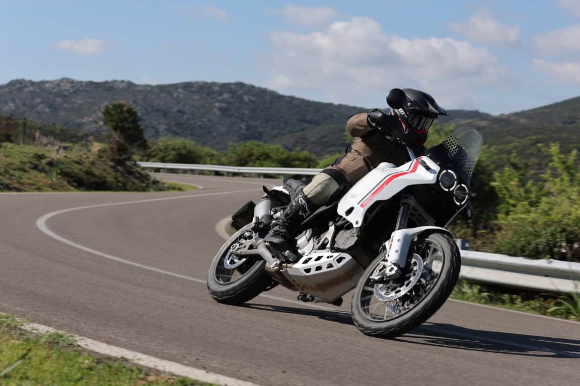 En daar zijn ze ook met de soepele Kayaba-vering en de opmerkelijk goed functionerende Pirelli-banden erg goed in geslaagd, want op de mooie bochtige bergwegen van Sardinië hadden we geen moment het idee dat we op een motor vol compromissen reden. De machine stuurt op de weg lekker licht en strak en blijft onder alle omstandigheden ook mooi stabiel. De comfortabele vering brengt ook geen onrust in de motor, ook niet als je op het laatste moment voor een haarspeldbocht alle ankers uit moet gooien. En ook in het terrein blijkt de DesertX het geweldig goed te doen. Offroad rijdt de DesertX heel erg makkelijk en stabiel, waarbij de setting van alle elektronische hulpsystemen ook zeer geslaagd is. Bij elk van de zes rijmodi heeft de fabriek een voorkeurselectie gemaakt qua vermogen, tractioncontrol, motorrem, gasreactie en ABS, waardoor de machine zich onder alle omstandigheden goed laat controleren. Zelfs de enorme en sportieve voorrem met twee 320 mm remschijven en heuse Brembo Stylema-remklauwen (menig sportieve motor kijkt er jaloers naar…) blijkt in het terrein niet teveel van het goede, waardoor de DesertX de spagaat van de Multistrada nòg verder weet op te rekken. Hij rijdt op straat waanzinnig goed en is dankzij de maximale belading van 240 kilo ook serieus bruikbaar als tweepersoons-reismotor, maar weet aan de andere kant ook lekker onverschrokken door het terrein te knallen.
