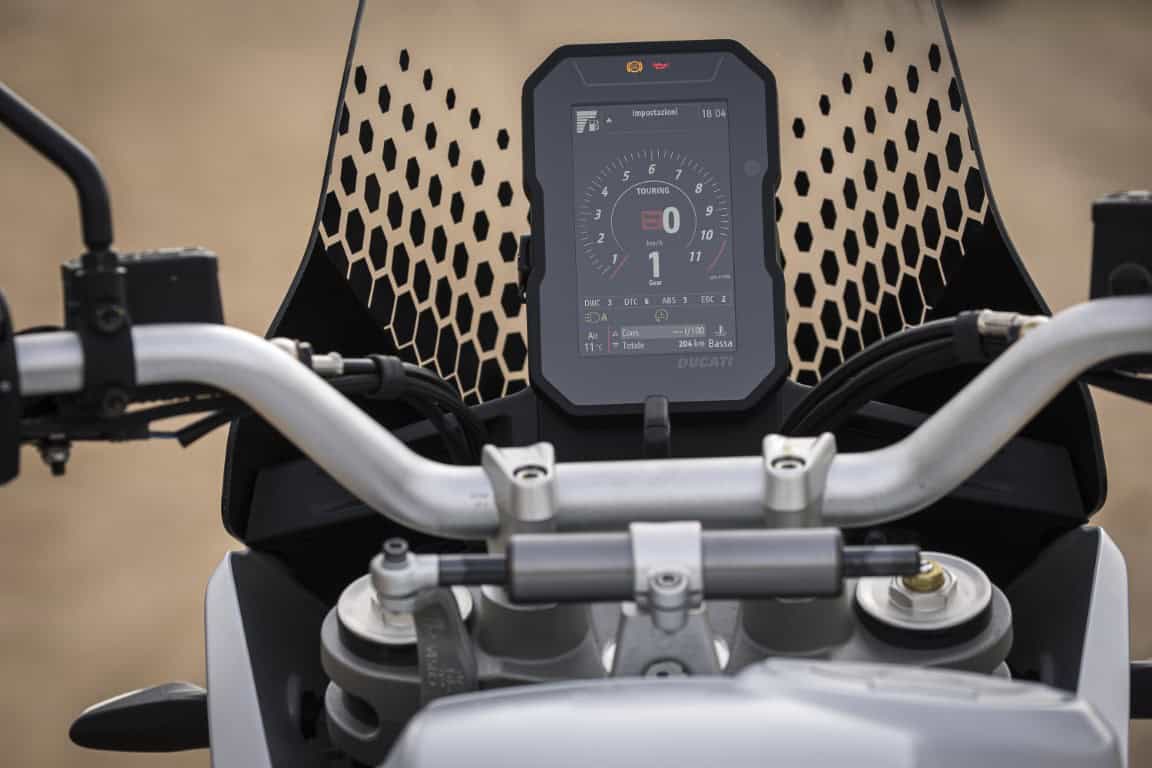 Qua elektronica ontbreekt het de nieuwe DesertX aan niets. De basis is overgenomen van de Multistrada, maar nu met een indrukwekkende zes rijmodi (Sport, Touring, Urban, Wet, Enduro en Rally), vier vermogensprofielen en instelbare tractieontrole, motorrem en wheelie controle. Van die zes rijmodi zijn Enduro en Rally specifiek bedoeld voor het onverharde, waarbij je ook het ABS geheel of gedeeltelijk kunt uitschakelen. Het blok hangt onder een gloednieuw stalen frame met volledig instelbare Kayaba-vering (230 mm veerweg voor en 220 mm achter), een stevige aluminium swingarm en relatief grote wielen (21 inch voor en 18 inch achter) met tubeless Pirelli Scorpion Rally STR-banden.