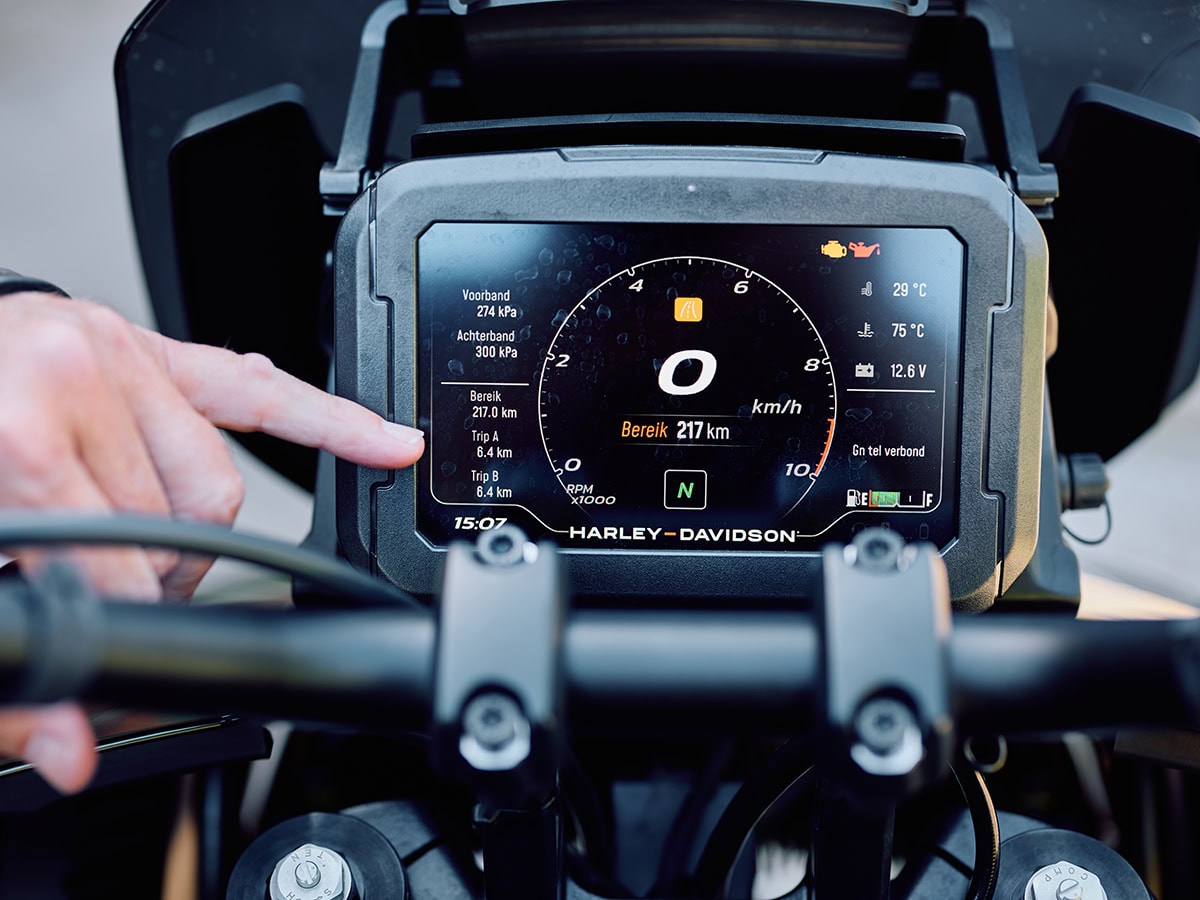 De blokken van allroad Pan America (eerste test hier) en crossover ST zijn gelijk. De V-twin is goed voor 150 pk bij 8.750 tpm en 125 Nm bij 6.750 tpm. Eenmaal opgewarmd en bij de les voelt de V-twin soepel en krachtig al komt hij van onderuit net iets minder sterk over dan een BMW GS of KTM Adventure. De ST loopt lekker door naar zijn maximale toerental van 9.500 tpm. Waar een ‘gewone’ Harley-Davidson al tien keer is afgehaakt gaat de ST enthousiast door.