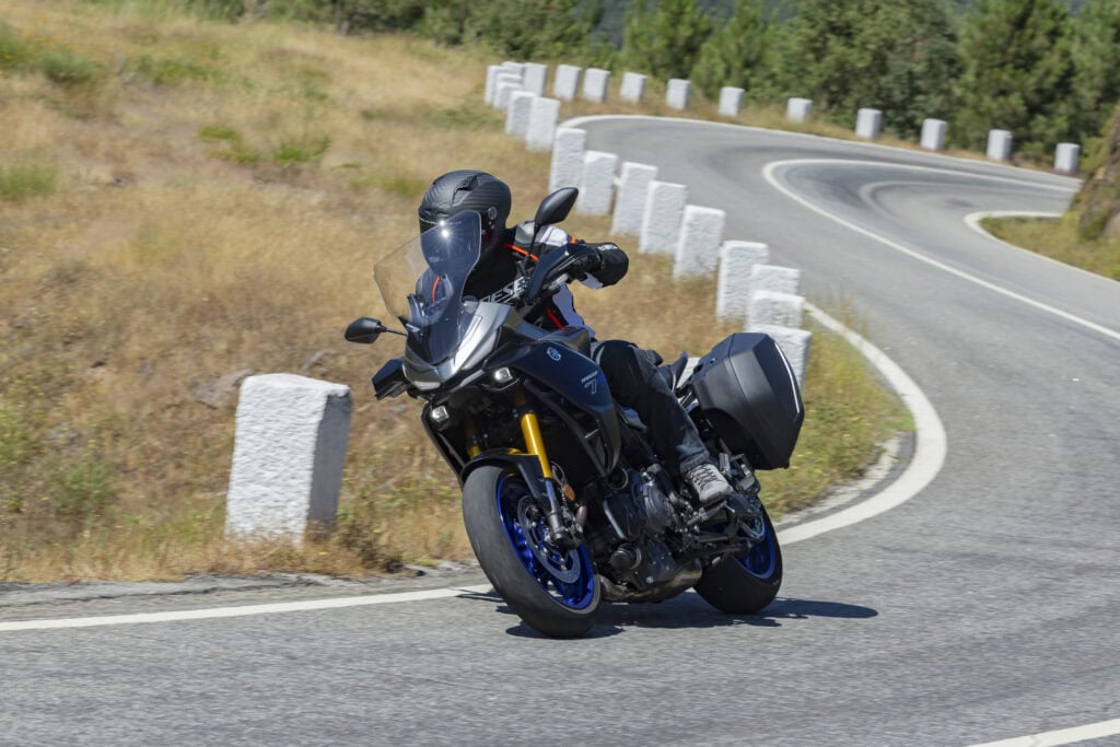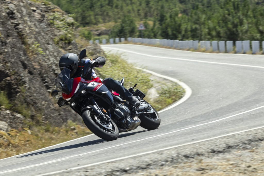 Dat legt wel iets extra gewicht in de schaal, want de GT weegt met de koffers een kleine zestien kilo meer dan de standaard versie. Overigens zijn beide modellen wat extra pondjes gekweekt: 5 kilo voor de standaard en 10 kilo (zonder koffers) voor de GT. Voel je die extra kilo’s? Zonder direct vergelijk is dat moeilijk te zeggen, want beide Tracers ontpoppen zich op het uitdagend slingerende Portugese asfalt nog steeds als bijzonder speelse sparringpartners. De standaard nog net iets meer dan de GT, die uiteraard de meeste extra kilo’s mee torst. Beide kunnen hun naked-genen nog steeds niet helemaal verbergen en dat is maar goed ook. Gevoelsmatig zit je dicht op het voorwiel wat voor een lekker direct stuurgevoel zorgt en die voorpartij geeft bovendien prima feedback. Beiden modellen laten zich haast kinderlijk eenvoudig van links naar rechts gloeien in de Portugese bochten-rollercoaster en blijven vervolgens heerlijk stabiel de ingezette koers volgen. Tel daar de ster van de show – de nog steeds heerlijk presterende CP2-tweecilinder met 270-graden-krukas – bij op en je hebt een haast verslavende combi. We durven we het bijna niet hardop te zeggen, maar meer heb je in een omgeving als deze eigenlijk niet nodig om enorm veel fun te hebben. Kenners zullen de gasrespons van het nieuwe ride-by-wire misschien iets minder direct vinden dan bij het voorgaande model, maar die gasreactie is wel heerlijk soepel en voorspelbaar, zowel in de Street- als in de Sport-modus. Geldt ook voor de remmen; voorspelbare en behapbare remkracht en uitstekend te doseren opgediend bovendien.