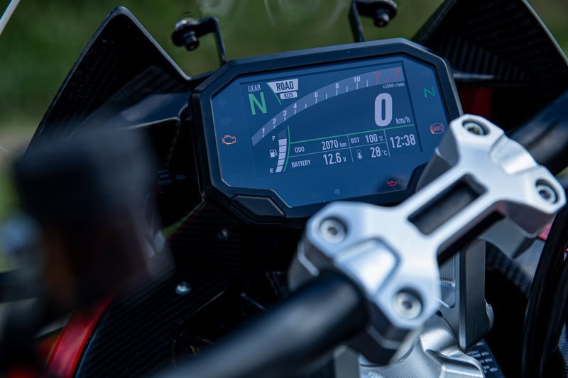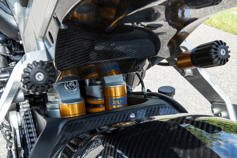 Vanwege het krappe tijdschema spring je liefst direct in het zadel, maar dat lukt niet. Je moet simpelweg de machtige machine en alle details waaruit hij is opgebouwd in je opnemen. Natuurlijk valt de naafbesturing vooraan op. Of de twee blinkende Öhlins dempers achteraan. Alleen al het tellen van alle carbon onderdelen neemt de nodige tijd in het beslag. Werkelijk overal blinkt het glanzende zwarte goud je tegemoet.