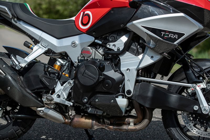 De Tera is weer een ouderwetse combinatie van een Italiaanse rijwielgedeelte en een Japans motorblok. Het is een discipline waarmee Bimota groot is geworden; potente krachtbronnen uit het land van de Rijzende Zon inbouwen in een frame dat in tegenstelling tot de standaardframes wel raad weet met alle paardenkrachten. Anno 2025 hoeft dat eerlijk gezegd echt niet meer door de onberispelijke kwaliteit van de laatste generatie Japanse frames, maar deze creatie is voor de heb, voor de mooi en omdat het kan. Je kunt je zelfs afvragen wat een in de basis praktisch type als een crossover met zoveel pk’s en extravagantie moet, maar het gebeurt vaker. Bij de vierwielers is de Lamborghini Urus daarvan een fraai voorbeeld.