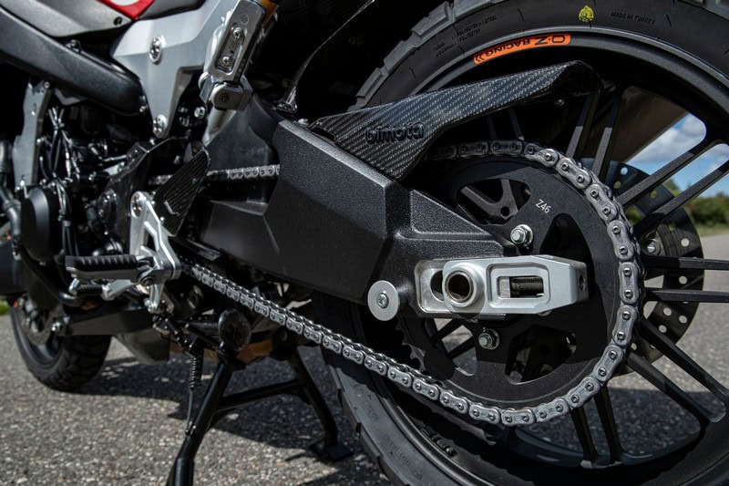 Comfort is meer dan alleen wat bescherming tegen rijwind, het is ook vering. Het afwijkende concept van de Tera bewijst zich direct. Deze motorfiets is geen stug afgeveerd Italiaans strijdros, maar een uiterst comfortabele reisgenoot. Grote en kleinere bulten brengt hij zeer succesvol terug tot minimale rimpeltjes. Alleen op boomwortels die hufterig lomp het asfalt omhoog drukken moet de Tera het antwoord schuldig blijven. Tegelijk: welke motorfiets weet daar wel raad mee? Nee, over veringcomfort op de Tera heb je werkelijk helemaal niets te klagen. Juist bij de extreem grote bulten geeft de naafbesturing zijn visitekaartje af. De vering verwerkt de impact zonder dat de sturing er onder te lijden heeft. Behoefte aan, of tijd voor, de vering verstellen was er niet. Mocht je dat toch willen dan is het fijn dat je achteraan perfect bij beide dempers kan. Eentje verwerkt zoals verwacht de krachten die op het achterwiel werken, de ander doet dat minder verwacht voor het voorwiel. Op dat voorwiel – een fraai gesmeed exemplaar van OZ – rust 52,5% van het gewicht en toch stuurt de motorfiets zoals gezegd uiterst licht. We blijven nog even bij het voorwiel want dat heeft 35° stuuruitslag, liefst 8° meer dan de Tesi H2. Je hoeft dus niet tien keer te steken om een straatje te keren en dat past goed bij een crossover. In vergelijking met directe concurrenten – voor zover een uniek ding als de Tera die al heeft – als de BMW M1000 XR (ook al goed voor € 31.060,-) en de Ducati Multistrada V4 Pikes Peak (€ 37.890,-) valt het wel op dat de dure Bimota niet over elektronische vering beschikt. Ook zijkoffers zitten er niet bij en dat kan ook helemaal niet. Bimota ontwikkelt ze momenteel namelijk nog.