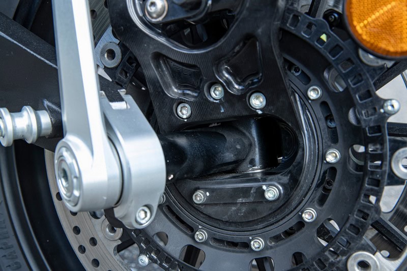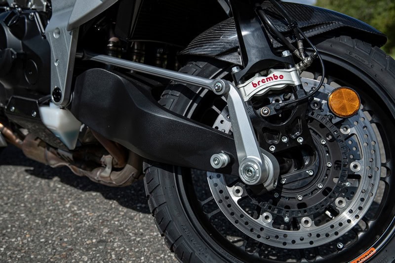 De Tera voelt dus opmerkelijk normaal, zelfs nog bij het remmen. De motorfiets duikt namelijk minimaal als je de remmen erbij pakt, of zo voelt het althans. Het is eerder de achterkant die onder invloed van de Brembo Stylema- remklauwen iets omhoog komt. Juist omdat de motorfiets amper duikt, lijkt het allemaal wel mee te vallen met de remkracht, maar je staat verdraaid snel stil. Dat de voorkant van de Tera echt niet duikt komt blijkt als je stilstaand de voorvork heen en weer probeert te bewegen. Dat gebeurt simpelweg niet.