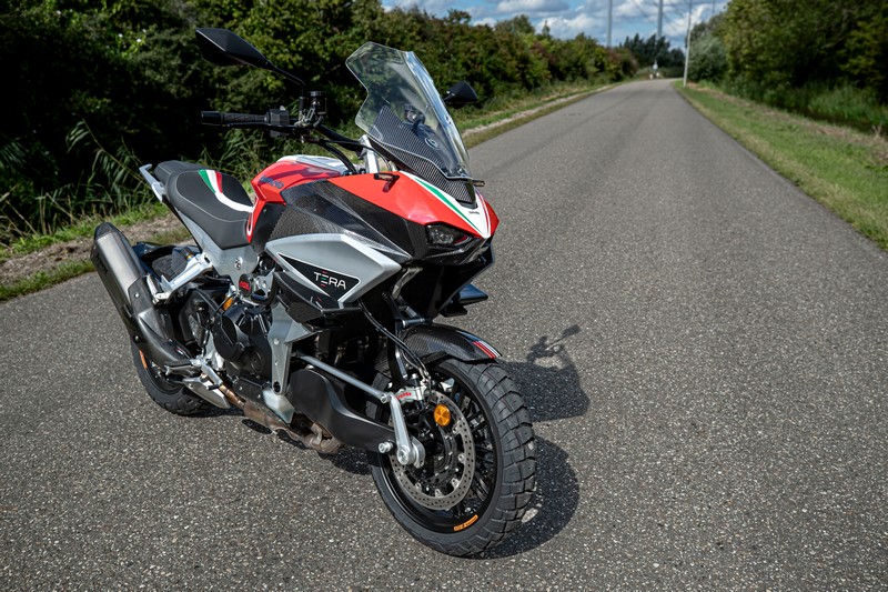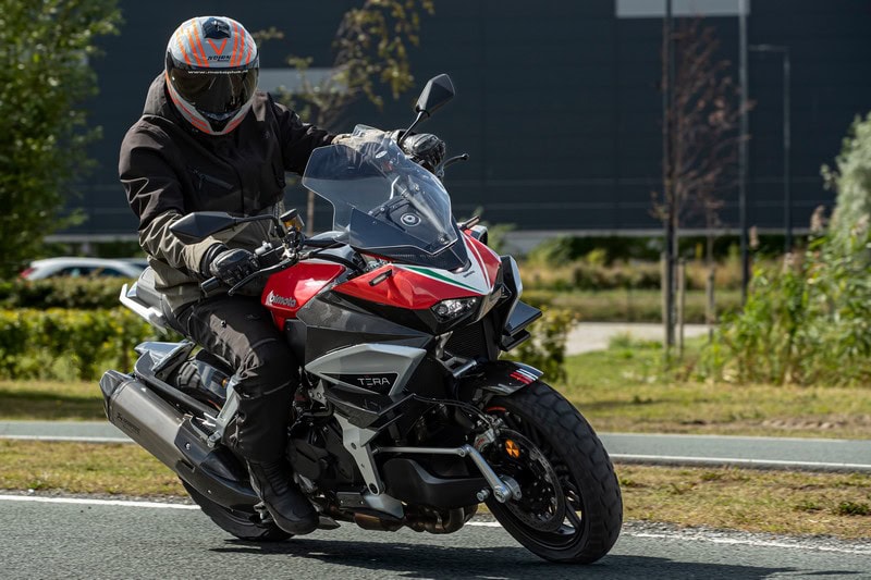Het gewichtige gevoel verdwijnt werkelijk de seconde dat je rijdt. Bij het stapvoets wegrijden twijfel ik heel even. Komt het door mij of door de voorwielophanging dat we wat zwalkend van de plek gaan? De eerste keer is tevens de laatste keer dat het gebeurt, het ligt dus aan mij. Het is echt bizar hoe normaal de Tera aanvoelt. Het is ook eventjes lastig te begrijpen dat de motorfiets die met rechtop zetten nog zo bullig aanvoelde zo makkelijk en licht instuurt. Geinig dat uitgerekend ‘normaal zijn’ zo verrassend kan zijn. Het bijbehorende vertrouwen is er ook direct. Snelle lange doordraaiers of kort werk? De Tera slikt het allemaal. Hetzelfde geldt voor de tientallen kleine rotondes op de weliswaar niet zo ideale, maar wel realistische testroute. Of een uitdagende stuurroute vraag ik me wel af of de grondspeling voldoende is. In mijn geval raakte (waarschijnlijk) de middenbok twee keer de grond.