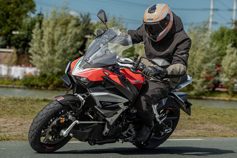 Een test van een motorfiets heeft in het ideale geval een lengte van honderden kilometers en vindt plaats in een omgeving die recht doet aan de motorfiets en aan zijn kwaliteiten. Dat is dit keer niet het geval. Niet alleen kunnen we de Bimota slechts een paar uur rijden, ook de crossover-component blijft achterwege omdat Kawasaki (de Japanse fabrikant heeft sinds 2019 de helft van de Bimota-aandelen in handen) liever geen kluiten modder op de motorfiets ziet. De volgende dag staat die namelijk alweer ingepland voor de volgende journalist. Het is eerder een voorstelrondje met een krachtige handdruk. Dat die later wat klef wordt komt door al het geweld dat de Tera ontplooit.