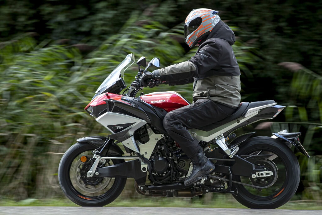 Een test van een motorfiets heeft in het ideale geval een lengte van honderden kilometers en vindt plaats in een omgeving die recht doet aan de motorfiets en aan zijn kwaliteiten. Dat is dit keer niet het geval. Niet alleen kunnen we de Bimota slechts een paar uur rijden, ook de crossover-component blijft achterwege omdat Kawasaki (de Japanse fabrikant heeft sinds 2019 de helft van de Bimota-aandelen in handen) liever geen kluiten modder op de motorfiets ziet. De volgende dag staat die namelijk alweer ingepland voor de volgende journalist. Boven dit artikel staat daarom bewust geen ‘Eerste test’ maar ‘Rij-impressie’. Het is eerder een voorstelrondje met een krachtige handdruk. Dat die later wat klef wordt, komt door al het geweld dat de Tera ontplooit.