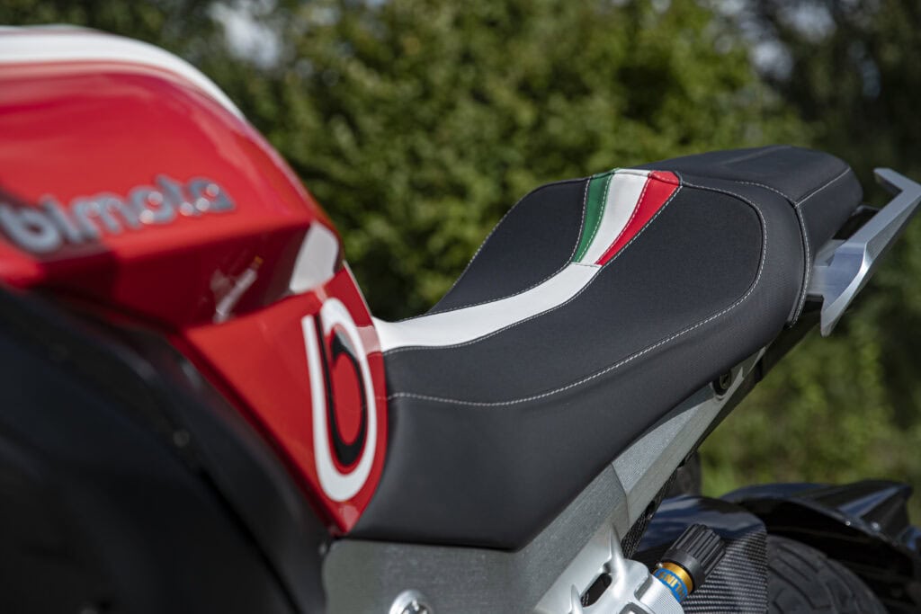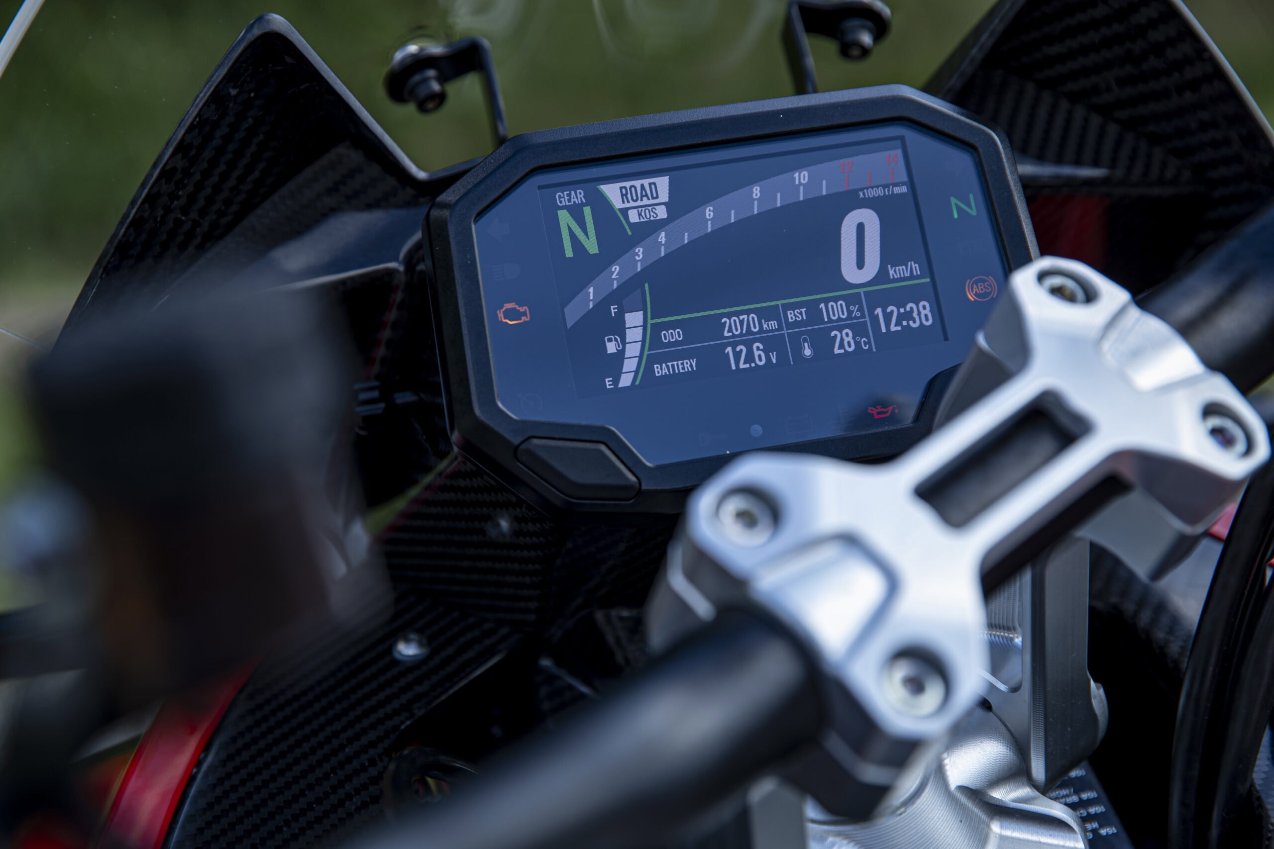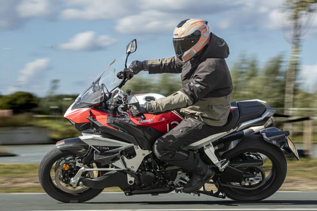 De Tera voelt dus opmerkelijk normaal, zelfs nog bij het remmen. De motorfiets duikt namelijk minimaal als je de remmen erbij pakt, of zo voelt het althans. Het is eerder de achterkant die onder invloed van de Brembo Stylema-remklauwen iets omhoog komt. Juist omdat de motorfiets amper duikt, lijkt het allemaal wel mee te vallen met de remkracht, maar je staat verdraaid snel stil. Dat de voorkant van de Tera echt niet duikt blijkt als je stilstaand de voorvork heen en weer probeert te bewegen. Dat gebeurt simpelweg niet. Het viercilinderblok is wel degelijk beschaafd en soepel te rijden, onderin pakt het vloeiend en prima hanteerbaar op. Het kan wel, maar… je wilt het niet en het is ook lastig voor elkaar te boksen. Elke keer wil je de bizarre acceleratie van de viercilinder ervaren. Het is geweldig hoe die eraan sleurt en het geluid van de met bizarre toerentallen draaiende compressor blijft uniek en al net zo verslavend als de uiterst vermakelijke krachtsontplooiing. Minder mooi is de klap bij het inschakelen van de eerste versnelling, de andere vijf glijden er volledig geruisloos en soepel in. Dit is al met al wel weer een motorfiets waarbij het allemaal veel sneller gaat dan je zelfs maar kunt bevroeden.