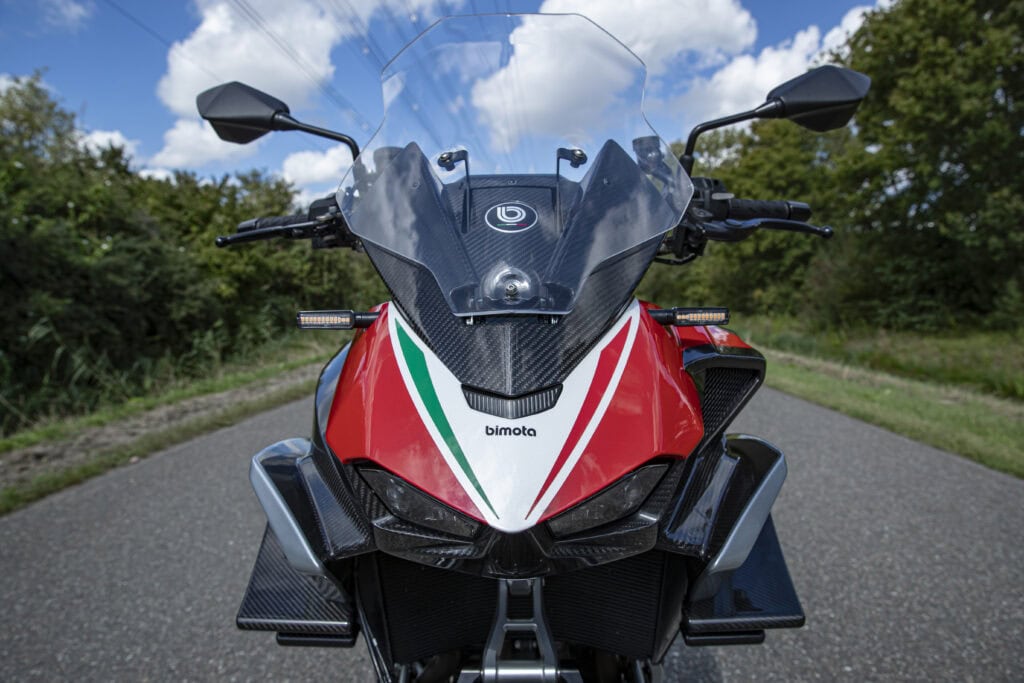 Omdat een crossover van alle markten thuis moet zijn, duiken we nog even de stad in. Het vertrouwen dat deze Japans-Italiaanse mix op gladde tramrails geeft onderstreept nog maar eens de kwaliteiten van het rijwielgedeelte. In de stad merk je wel dat de krachtbron niet alleen met pk’s strooit, maar ook met graden Celsius. Er komt flink wat hitte van de viercilinder af. Die warmte waait op de snelweg dan weer gewoon weg. Op het lange rechte eind vallen twee zaken op. De banden met het zeer grove noppenprofiel laten zich allereerst uitgerekend bij 100 km/uur wat voelen. Leuk feitje: deze noppenband is gehomologeerd tot 270 km/uur. Iemand nog behoefte aan de ultieme woestijnracer? Op de snelweg voelt de Tera stabiel en tegelijk wat onrustig in het stuur. Alsof het stuur in rubber is gemonteerd. Tegelijk gaat de Bimota strak rechtdoor en is er dus weinig aan de hand. De bediening van het kuipruitje levert weer zo’n aha-erlebnis op. Het zit ook op de Ninja 1100SX. Het ruitje schuift dus niet omhoog of omlaag, maar kiept alleen een paar graden naar voren of achteren. Voor mijn 1,80 meter is het in de lage positie prima. Geen gekmakende turbulentie rond mijn helm en tegelijk prima windbescherming tot mijn schouders. Comfort is meer dan alleen wat bescherming tegen rijwind, het is ook vering. Het afwijkende concept van de Tera bewijst zich direct. Deze motorfiets is geen stug afgeveerd Italiaans strijdros, maar een uiterst comfortabele reisgenoot. Grote en kleinere bulten brengt hij zeer succesvol terug tot minimale rimpeltjes. Alleen op boomwortels die hufterig lomp het asfalt omhoog drukken moet de Tera het antwoord schuldig blijven. Tegelijk: welke motorfiets weet daar wel raad mee? Nee, over veringcomfort op de Tera heb je werkelijk helemaal niets te klagen. Juist bij de extreem grote bulten geeft de naafbesturing zijn visitekaartje af. De vering verwerkt de impact zonder dat de besturing er onder te lijden heeft. Behoefte aan – of tijd voor – de vering verstellen was er niet. Mocht je dat toch willen, dan is het fijn dat je achter perfect bij de beide dempers kunt komen. Eentje verwerkt zoals verwacht de krachten die op het achterwiel werken, de ander doet dat minder verwacht voor het voorwiel. Op dat voorwiel – een fraai gesmeed exemplaar van OZ – rust 52,5 procent van het gewicht en toch stuurt de motorfiets zoals gezegd uiterst licht. We blijven nog even bij het voorwiel, want dat heeft 35 graden stuuruitslag, liefst 8 graden meer dan de Tesi H2. Je hoeft dus niet tien keer te steken om in een straatje te keren en dat past goed bij een crossover. In vergelijking met zijn directe concurrenten – voor zover een uniek ding als de Tera die al heeft – zoals de BMW M1000 XR (ook al goed voor € 31.060,-) en de Ducati Multistrada V4 Pikes Peak (€ 37.890,-) valt het wel op dat de dure Bimota niet over elektronische vering beschikt. Ook zijkoffers zitten er niet op en dat kan ook helemaal niet. Bimota is momenteel namelijk nog bezig die te ontwikkelen.