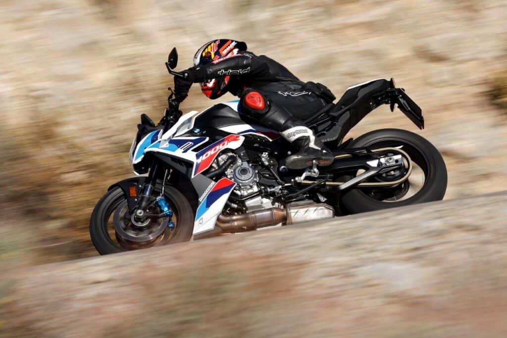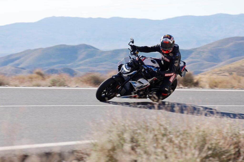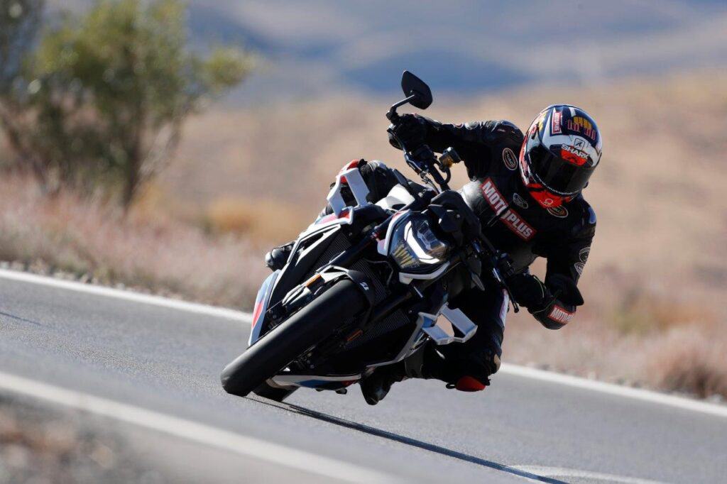 Die wielen rollen plotseling voorbij circuit Almería en daar mogen we een paar rondjes achter een voorrijder. Helaas ligt het tempo te laag om de RS11’s eens goed uit te proberen, maar het lange rechte stuk geeft wel even de mogelijkheid om de motor lekker door te halen. En wat háált die dikke duizend door zeg! De vermogensopbouw is mooi lineair, maar die opbouw gaat tot ver voorbij 13.000 toeren door en pas richting 15.000 toeren neemt de dadendrang af. BMW claimt 0-200 km/uur in 7,2 seconden en een topsnelheid van 280 en daarmee begeeft deze 199 kilo lichte machine zich nadrukkelijk in superbike-territorium. Wellicht is de M1000R een aardige nektrainer voor F1 coureurs? Langdurig dit snelheidspotentieel uitnutten gaat je nek zeker niet in de koude kleren zitten namelijk. Wel gaaf dat het kan!