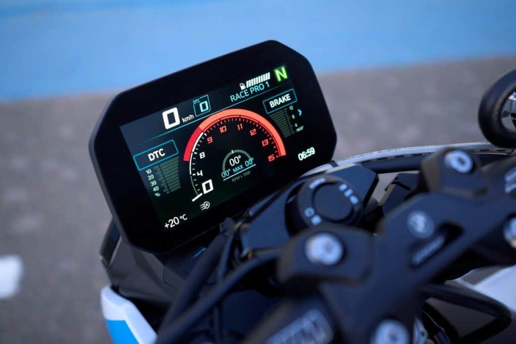 Rap komt de vurige vierpitter op temperatuur en het rijwielgedeelte is nu net zo accuraat als de krachtbron. Hobbel(tje)s worden beduidend beter geabsorbeerd, maar vooral zorgt de zachtere demping voor iets meer gewichtsverplaatsing rondom de dwarsas en dat zorgt er voor dat het insturen en op lijn blijven nu helemaal fijn is. Ik hoorde enkele rijders hier ook over en zij dachten dat dit aan de banden lag. De Bridgestone RS11’s zijn tamelijk stevig en puntig voor de soms wat pokdalige bergwegen, met de opmerking dat de bandenspanning koud 2.5 voor en 2.3 achter was gedurende de hele test, volgens het dashboard. Kortom, de iets mildere veringinstelling heeft het rijgedrag flink opgefleurd. In ieder geval mooi om te zien dat de M1000R zo goed reageert op een paar eenvoudige aanpassingen, die met enkele bewegingen van de draai/kantel schakelaar op de linker stuurhelft te bereiken zijn.
