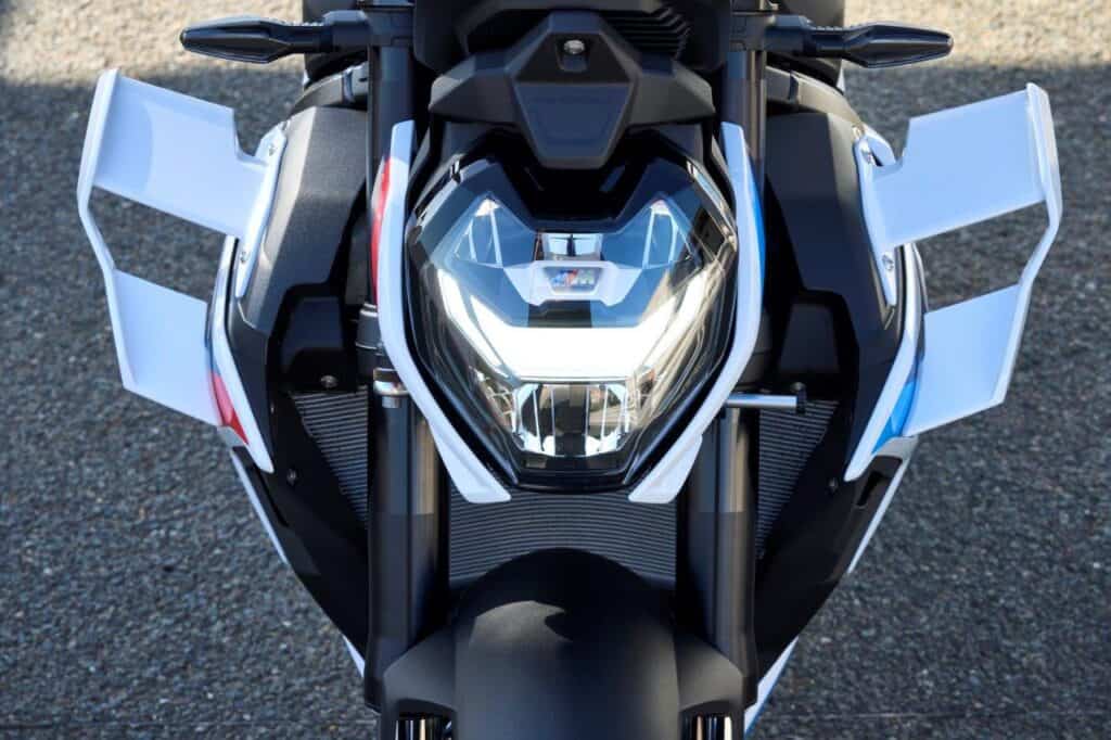Wat betreft het ontwerp is het altijd interessant om te zien wat de aërodynamica met het uiterlijk doet. Bij de M is dit fraai geïntegreerd in de machine en verleent het de machine een brede schouderpartij die extra vertrouwen uitstraalt. De vleugels genereren bij 220 km/uur een neerwaartse druk van 11 kilogram en bij de geclaimde top van 280 km/uur zal dat 14 kilogram zijn. Op de Duitse Autbahn of tijdens een circuitdag zal dit behulpzaam zijn, zoals bij MotoGP, om beter te kunnen versnellen en vooral te kunnen remmen, maar zeker ook voor een verbeterde stabiliteit. Bovendien bleek in BMW’s windtunnel een groot winstpunt dat de wind rondom de knieën van de rijder wordt geleid. Ondanks de downforce heeft de M daardoor toch een lagere Cw-waarde. Al met al is de M1000R een stoere verschijning, er staat een lekker zelfbewust type op zijn wielen.