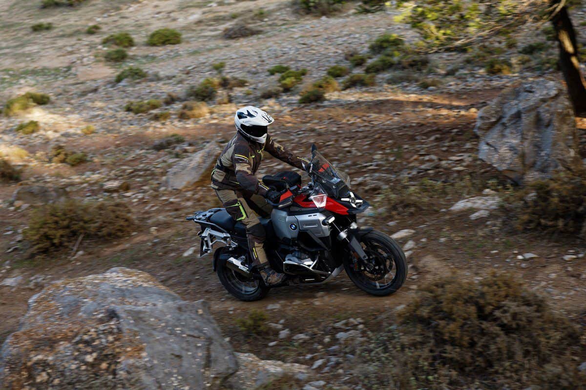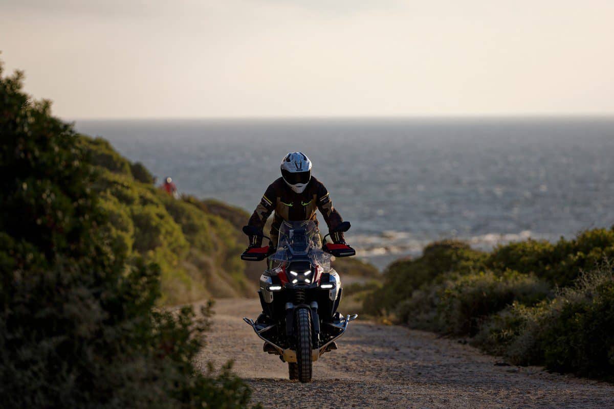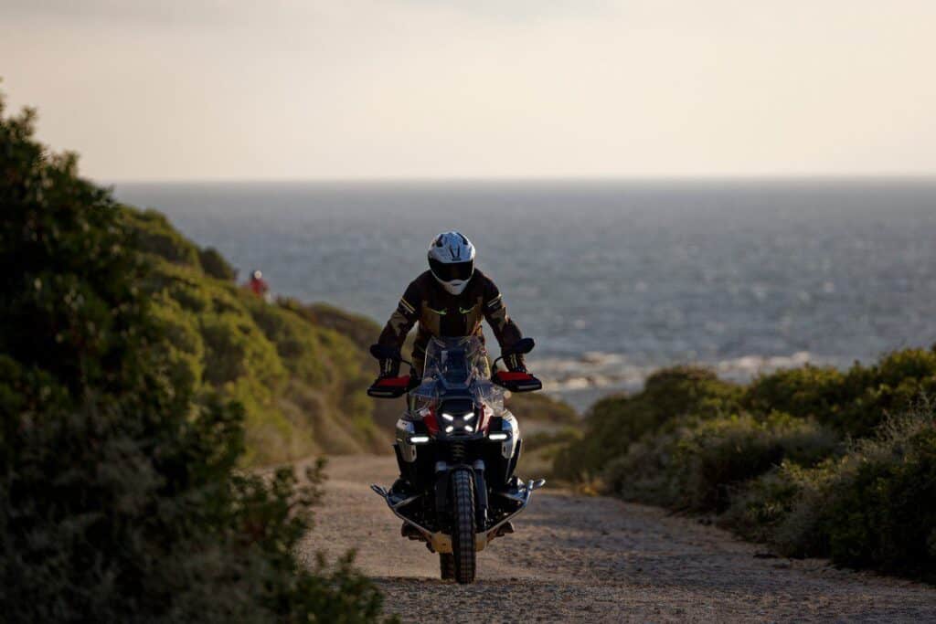 Wanneer de eerste slingers van het Spaanse achterland zich aandienen, vraagt de Adventure eerst wat gewenning. Dat heeft een tweeledige reden: allereerst liggen er vanwege de geplande offroadexcursies Metzeler Karoo 4’s om de spaakwielen en deze typische 50/50 band (on-/offroad) heeft even tijd nodig om op te warmen. Daarnaast blijkt de Road-modus wel erg op comfort gericht qua afstelling van de vering. Overschakelen naar de (optionele) Dynamic Pro-modus met een straffere setting van vering brengt vervolgens enorm veel verbetering. De motorfiets is veel makkelijker in te sturen en op lijn te houden, blijft bovendien bij het aanremmen ook veel stabieler.