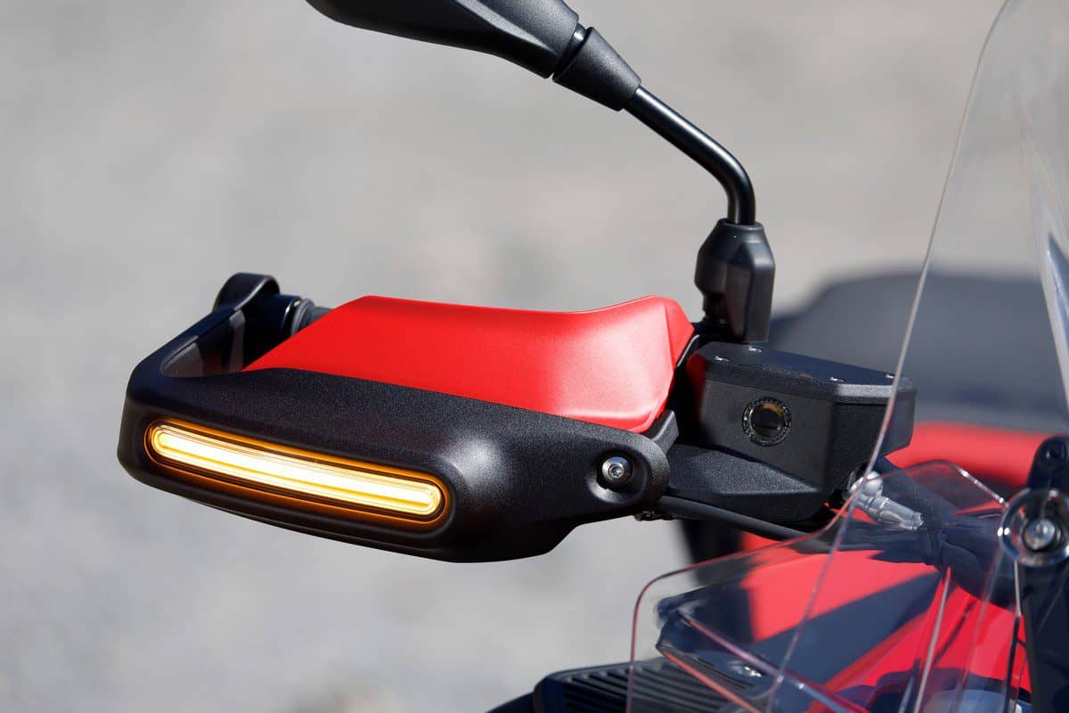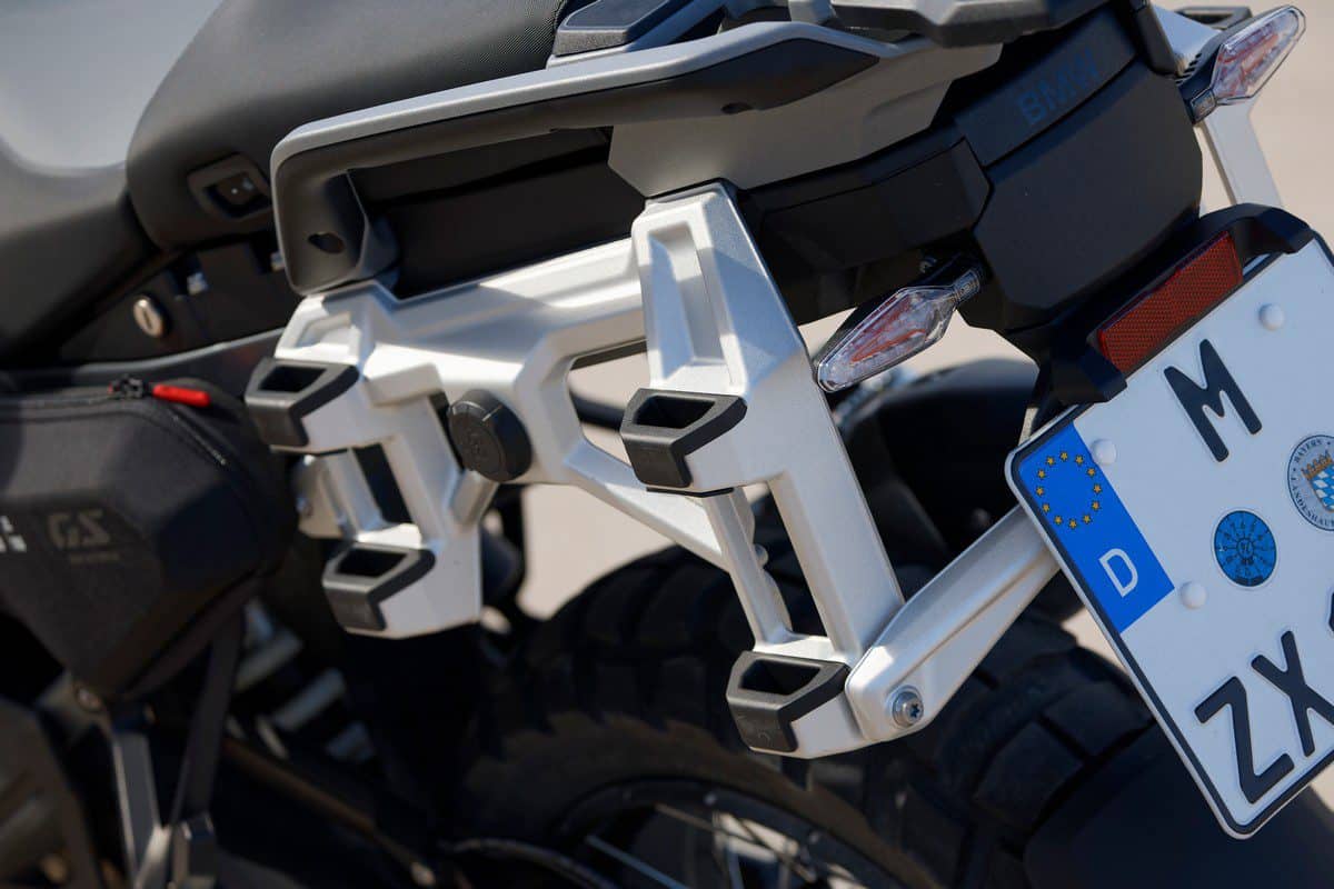 Verder is de Adventure standaard voorzien van een stevige aluminium carterbeschermer, een hogere ruit, hoger stuur, enduro voetsteunen, een set valbeugels en kofferdragers met magnetische koppeling voor onder meer de binnenverlichting en USB-aansluiting. Zeer praktisch trouwens. Die koffers zijn overigens niet standaard, maar optioneel (zijkoffers vanaf € 1.179,00, topkoffers vanaf € 641,00).