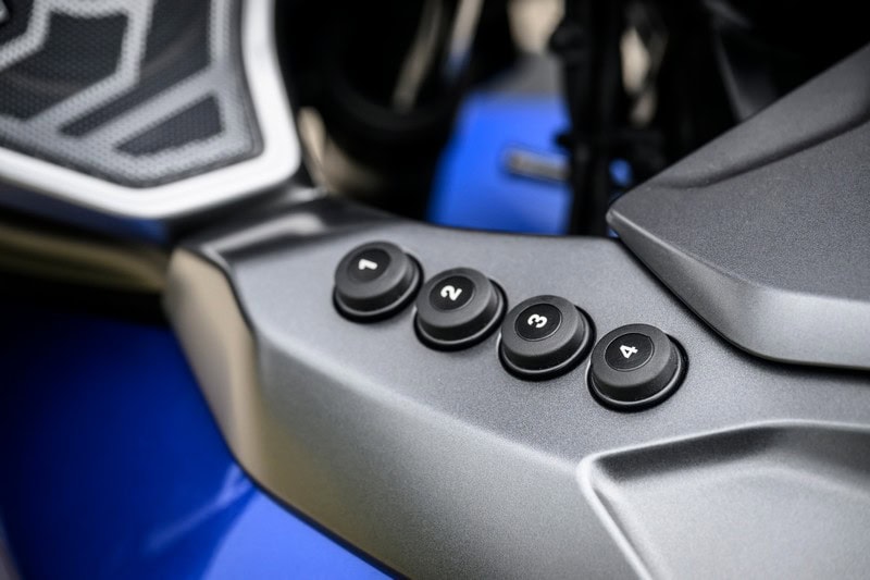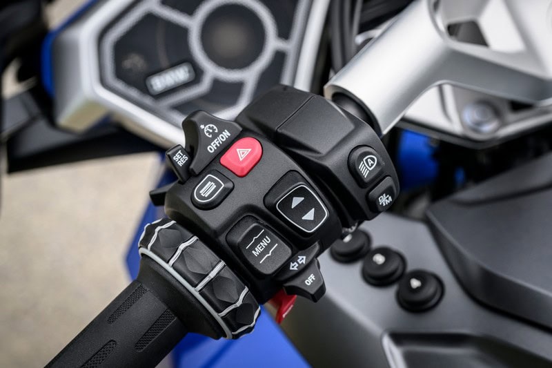 Een passagier is beter af op een 1300 in plaats van een 1250. Het duozadel is verlengd voor meer bewegingsruimte, voetsteunen zijn lekker breed en – geloof het of niet – een passagier zit met zijn rug tegen een verwarmde topkoffer en zijn handen rusten op een eveneens verwarmde vasthoudrail. De passagier denkt hierdoor hetzelfde als de bestuurder: ‘Bij deze motorfiets draait het helemaal om mij.’ En inderdaad: de groottoerist en forens staan volledig centraal bij de machine. Een sportieveling denkt hetzelfde bij zijn M1000RR, maar het is opvallend hoe deze motorfiets volledig in dienst staat van zijn bestuurder. Dat blijkt onder meer uit het gemak waarmee alle elektronica zich laat bedienen. De machine biedt bijvoorbeeld de mogelijkheid om voor jou belangrijke functies te programmeren onder de vier knoppen in het kuipwerk. Zo kom je snel waar je wilt zijn. De linker stuurhelft herbergt nog zo’n knop. Het is logisch om daar de bediening van de kuipruit onder te zetten. Kun je bij lelijk weer of hogere snelheden het scherm direct hoger of lager zetten.