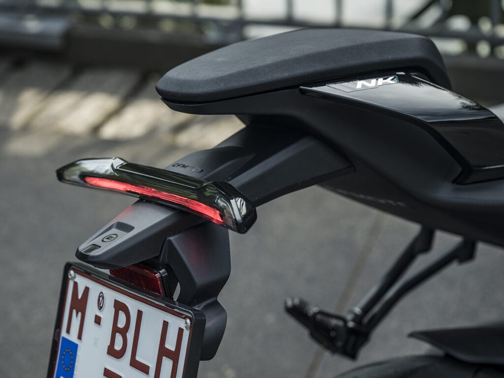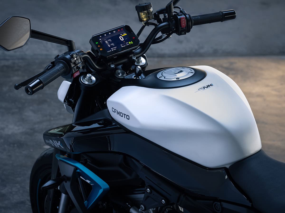 Op uitnodiging van CFMoto Benelux togen we naar Luxemburg voor de eerste kennismaking met de nieuwe driepitter. De eerste indruk mag er in ieder geval zijn: de 675NK is qua styling allesbehalve eenheidsworst. Heeft een lekker eigenzinnige smoel, dat mooi aansluit bij dat van de rest van het NK-gamma, zonder dat het polariserend werkt. Een fijn sportief smoelend beestje ook, met mooie scherpe, licht naar voren aflopende lijnen die ‘m een dynamische uitstraling geven. Ook over de afwerking niets te klagen, de motorfiets oogt opgeruimd zonder los liggende stekkers, kabel of slordige kieren. De machine komt er daarbij in twee kleuren: wit/zwart/blauw en grijs/zwart, waarbij die eerste toch wel de persoonlijke favoriet is. Oogt net wat frisser dan de grijs/zwarte-variant, die overigens ook zeker niet verkeerd is.