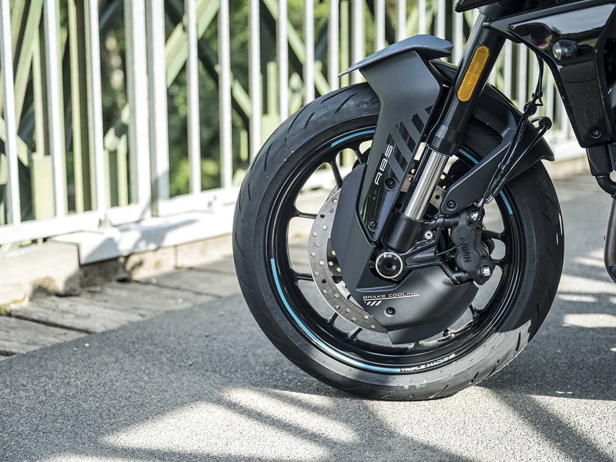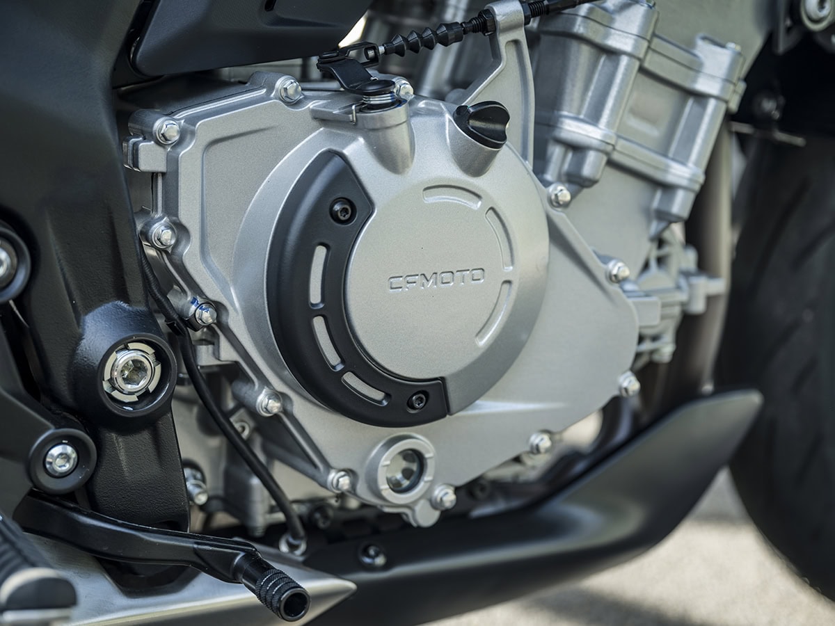 Een beetje inzoomend op de technische specificaties kun je je niet aan de indruk onttrekken dat er met een scheef oog is gekeken naar een andere bekende driecilinder krachtbron, en wel die van de Triumph Street Triple 675. De boring keer slag verhouding van 72 x 55,2 komt redelijk overeen en daarnaast kent het blok ook de karakteristieke regelmatige ontstekingsintervallen van om de 240°. CFMoto kiest overigens wel een iets andere weg op prestatiegebied. De focus ligt niet zozeer op zoveel mogelijk peut uit het blok persen, maar veel meer op duurzaam- en beheersbaarheid. Met 90 pk bij 11.000 en 68 newtonmeter koppel bij 8.250 toeren ben je overigens alsnog allesbehalve schraal bedeeld op dat vlak.
