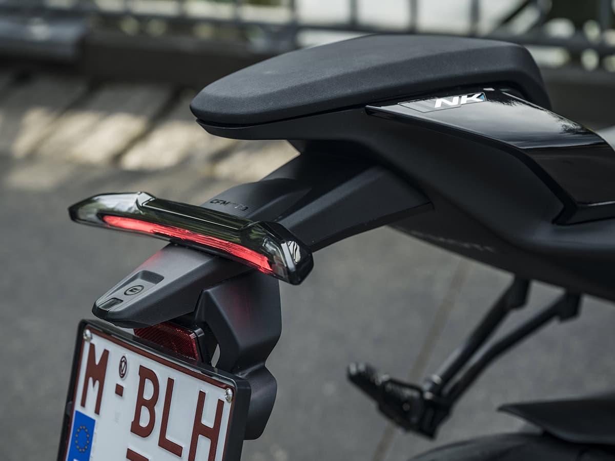 Die lijn kun je trouwens op bijna alle vlakken wel doortrekken. Zeker de bijzonder aantrekkelijk verkoopprijs van € 7.999,- (België € 6.999,-) in ogenschouw genomen, is de 675NK gewoon enorm goed en rijk opgetuigd. Een stalen brugframe vormt de basis van het rijwielgedeelte, met aan de voorzijde een Ø 41 mm upside-down voorvork en een monoschokdemper aan de achterzijde, beide van KYB en op de ingaande demping achter na volledig instelbaar. De remmerij, dubbele Ø 300 mm schijfrem voor met radiale vierzuigerremklauwen en een enkele Ø 240 mm schijf achter met enkelzuigerremklauw, komt daarnaast uit de schappen van Brembo-dochter J.Juan. ABS is uiteraard standaard aan boord, net als tweevoudig instelbare tractiecontrole (tevens uitschakelbaar). Deze zijn overigens niet hellingshoekafhankelijk, die scherpe prijs moet immers ergens vandaan komen. Dat zie je ook enigszins terug aan het standaardschoeisel: om de aluminium gietwielen zit namelijk CST S3N rubber. Niet echt een hardloper bij de plaatselijke bandenboer, maar dat wil niet zeggen dat ze niet goed zijn natuurlijk.