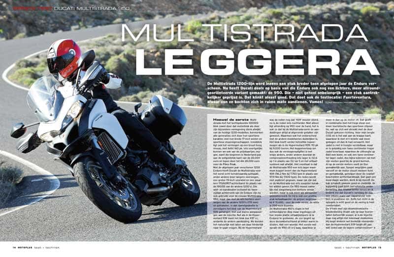Na de lunch is het de beurt aan de machine mét het Touring-pakket. Dit houdt in dat deze 950S naast de al eerder genoemde handvatverwarming ook is voorzien van een middenbok, twee zijkoffers en spaakwielen. Maakt het veel verschil? Qua rijden niet, qua mogelijkheden natuurlijk wel. Je kunt immers veel meer meenemen dan zonder koffers. Overigens zijn zowel de standaardversie als ‘S’ beide uitgerust met een usb- en 12V-aansluiting onder de buddy. Heel handig. Het laatste stuk van de in totaal 320 kilometer lange tocht leggen we af op de snelweg. Hier komt het handmatig verstelbare ruitje goed tot zijn recht. Met het ruitje in de hoogste stand is het prima vertoeven op hoge snelheid, wat de allround-kwaliteiten nogmaals onderstreept. Terug naar de hamvraag: is groter per definitie beter? Het antwoord zal niemand verbazen: Nee, niet bepaald. Rijplezier is nooit puur en alleen afhankelijk geweest van een flink vermogen en dik blok. Het kan natuurlijk helpen, maar de nieuwe 950 bedient je op alle fronten zeer rijkelijk. Zeker in de ‘S’-variant die met al zijn elektronisch vernuft op iedere situatie een meer dan passend antwoord heeft. De nieuwe Multistrada 950S wordt begin april bij de dealer verwacht en is te koop voor € 18.590,-.