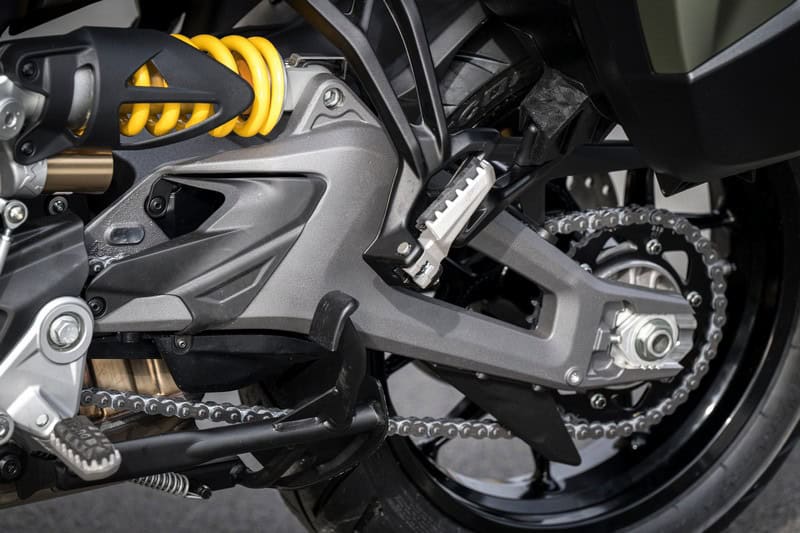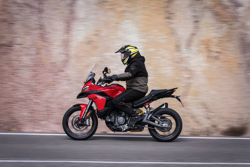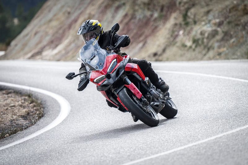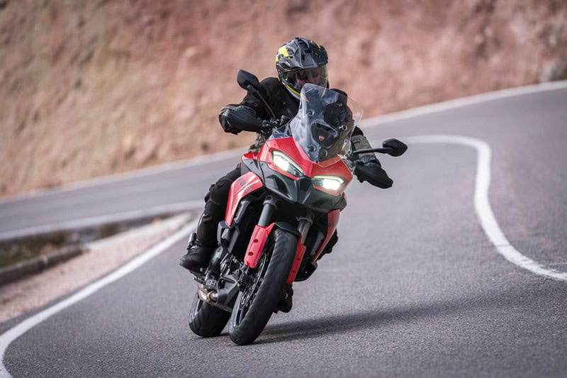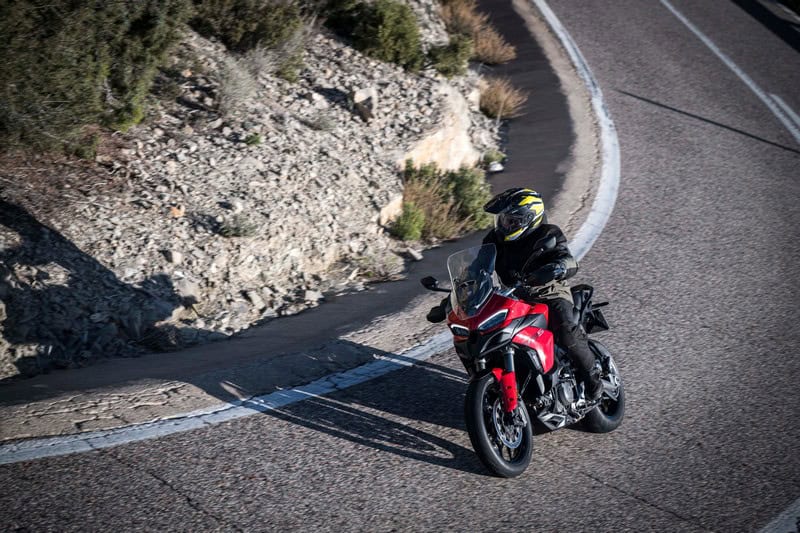 Anoniem kun je Ducati’s nieuwste troef in het middensegment niet noemen: het V2-blok is een plaatje voor een crossover als de Multistrada. Specifiek voor dit model heeft het een kortere eerste versnelling en een langere zesde en het heeft een twintig procent zwaarder vliegwiel om het blok soepeler rond te laten draaien. Onderin draait het blok al prachtig soepel rond en dat blijft het eigenlijk over het hele toerengebied doen. Als het speelkwartier in volle gang is, bivakkeer je ergens tussen de 3.500 en 8.500 tpm en in alle gevallen heb je niets te klagen. Het blok sleurt je altijd krachtig de bocht uit. Niet bedreigend, maar tegelijk krachtig en vooral ontzettend leuk. De prima gasreactie sluit daar prima bij aan. Zo is motorrijden bedoeld. Aan trekkracht kom je niets te kort op stuurwegen. Alleen die ene keer dat we in zesde versnelling een vrachtwagen passeren, had iets meer vermogen leuk geweest, maar een keertje terugschakelen is ook geen straf dankzij de standaard quickshifter. Als Ducati om kosten te besparen zulke heerlijke desmo-loze blokken blijft bouwen om alles betaalbaar te houden, hebben ze mijn zegen.