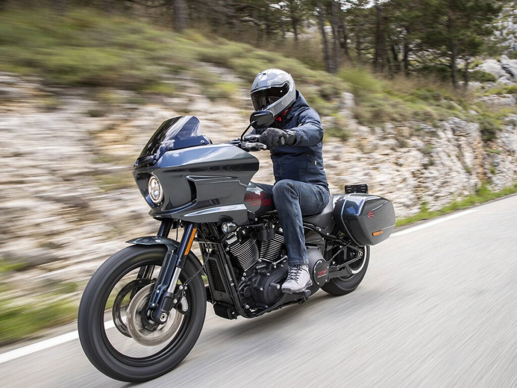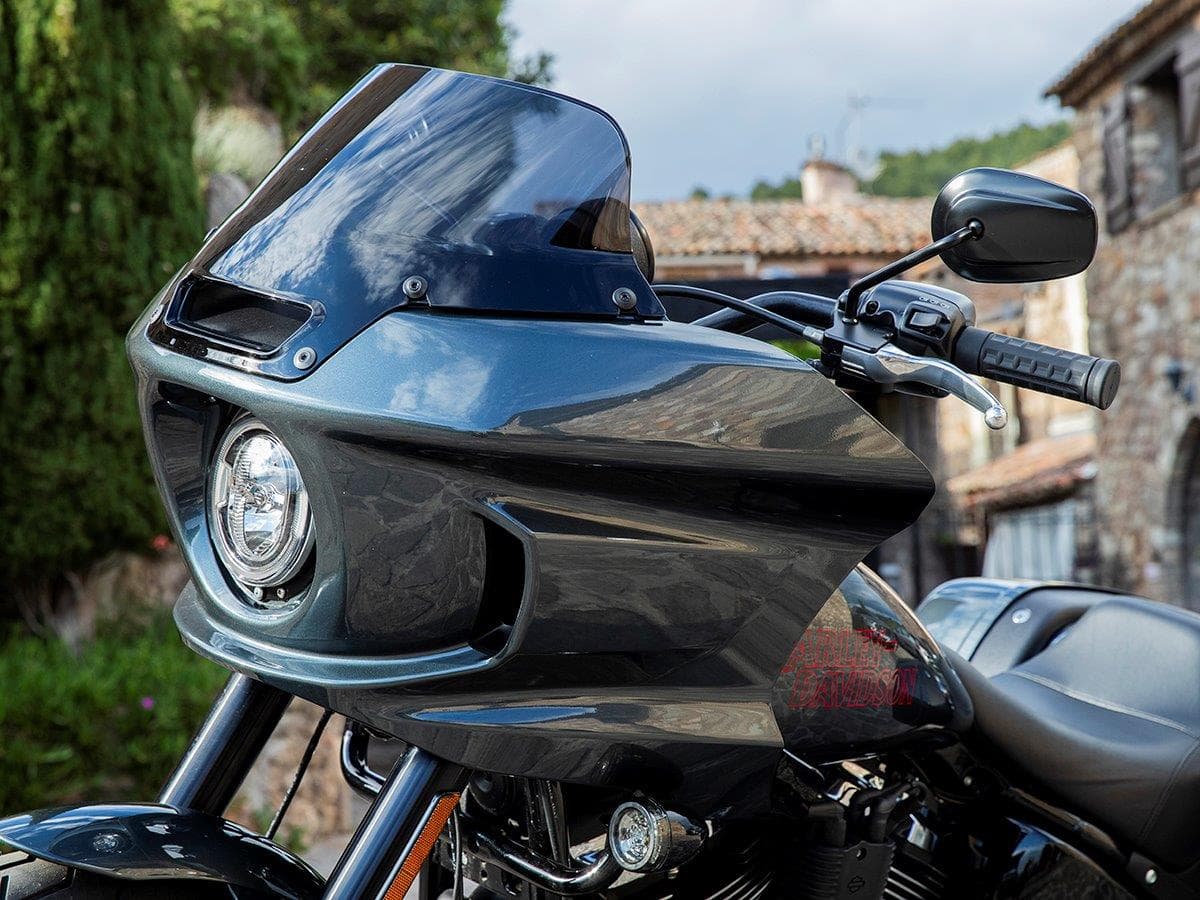We starten de dag, die in het drukke stads verkeer van Nice begint, voor de stijl even in de Rain-modus. Hierbij wordt met name het koppel begrensd om te voorkomen dat het achterwiel begint te slippen in (natte) situaties met weinig grip en is de gasrespons het meest tam. Die gasreactie is ook in de Road-modus heerlijk voorspelbaar, alleen is de koppelafgifte in dit geval nadrukkelijk vlak. Kortom, een fijne modus voor de dagelijkse praktijk en stadsverkeer. Maar wij laten de drukte van Nice gelukkig al snel achter ons en zetten koers richting het glooiende, rotsachtige achterland en dat roept al snel om standje Sport. Anders dan de beide andere rijmodi heeft de Sport-modus een specifieke setting voor de drie motorconfiguraties Classic, Custom en High Output. In Classic ligt de nadruk daarbij op een vlakke en soepele koppelafgifte, bij Custom is dat koppel wat breder uitgesmeerd, waarbij het middengebied duidelijk wat sterker aanvoelt, en in de High Output-specificatie van de Low Rider S en ST is dat middengebied ook sterker en zet het blok tot zo’n 5.000 toeren ook nog een behoorlijk eindsprintje in. Het maakt de S en ST in deze modus, waarin de gasrespons ook nog steeds lekker soepel is, in ieder geval de meest levendige en sportiefste Softails om te rijden, waarbij iedere dot gas op een hoger toerental vergezeld gaat van een aanstekelijke, maar niet irritant luide roffel uit de enkele uitlaatdemper. Het tovert in ieder geval al snel die ‘big smile’ op je gezicht.