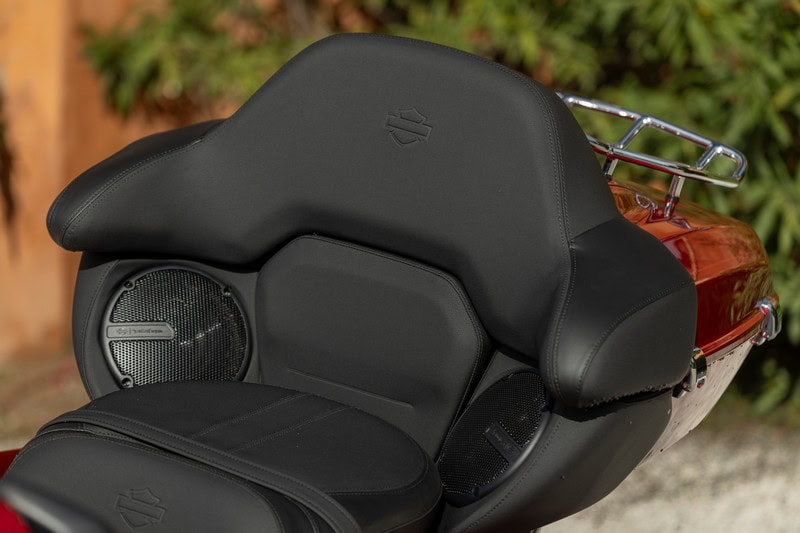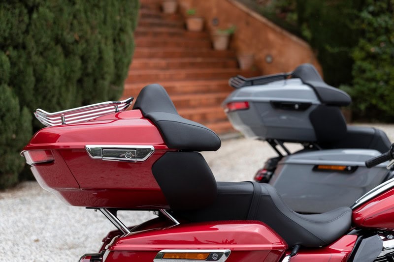 De komst van de Limited betekent niet het einde van de reguliere Road en Street Glide. De Limited staat er als een übermodel naast. Het prijsverschil – € 41.995,- om € 38.495,- is er niet voor niets. Wat de verschillen zijn? Zonder hier compleet te zijn is het meest in het oog springende verschil natuurlijk de immense topkoffer. Die twee helmen vinden in ieder geval moeiteloos een plekje tijdens het selfie-moment op de prairie. De 68L koffer biedt verder ruimte aan een 12V-aansluiting, een bagagerek, twee Ø 165 mm speakers, een enorme LED-lichtbalk en een ruggesteun voor de passagier. In totaal beschikt een Limited over vier speakers met een gecombineerd vermogen van 200 watt.
