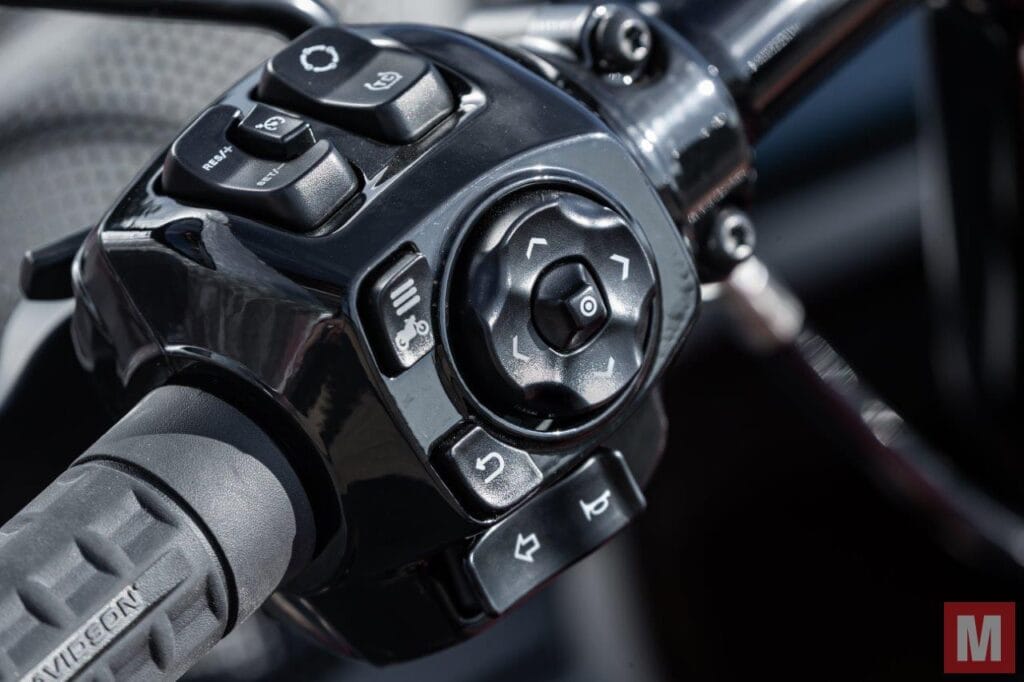 De diverse modi selecteer je met de menuknoppen op de linker stuurhelft of middels het liefst 31,2 centimeter brede en nieuwe touchscreen-TFT-display dat als een soort privé-Imax-theater voor je in de stroomlijn huist. Het gigantische scherm is onderdeel van het door Harley-Davidson Skyline OS gedoopte infotainmentsysteem en is digitale cockpit, navigatiesysteem, mediahub en communicatiecentrale in een. Naast bediening middels de knoppen op het stuur is het systeem ook met spraak aan te sturen of met een motorhandschoen met touchscreen-pad op de wijsvingers. Het vraagt even gewenning om het systeem te leren kennen, maar als je het eenmaal in de smiezen hebt, werkt het erg logisch en maken de grote iconen op het scherm het je makkelijk om steeds dieper in het systeem af te dalen…en er ook weer uit te klauteren. Ook de verbinding met een smartphone is snel gemaakt en vervolgens is muziek streamen kinderspel naar de standaard gemonteerde luidsprekers. De telefoon kan trouwens worden opgeladen in het gepolsterde vakje in de stroomlijn. Het versterkervermogen van 200 Watt zorgt daarbij voor een prima sound.