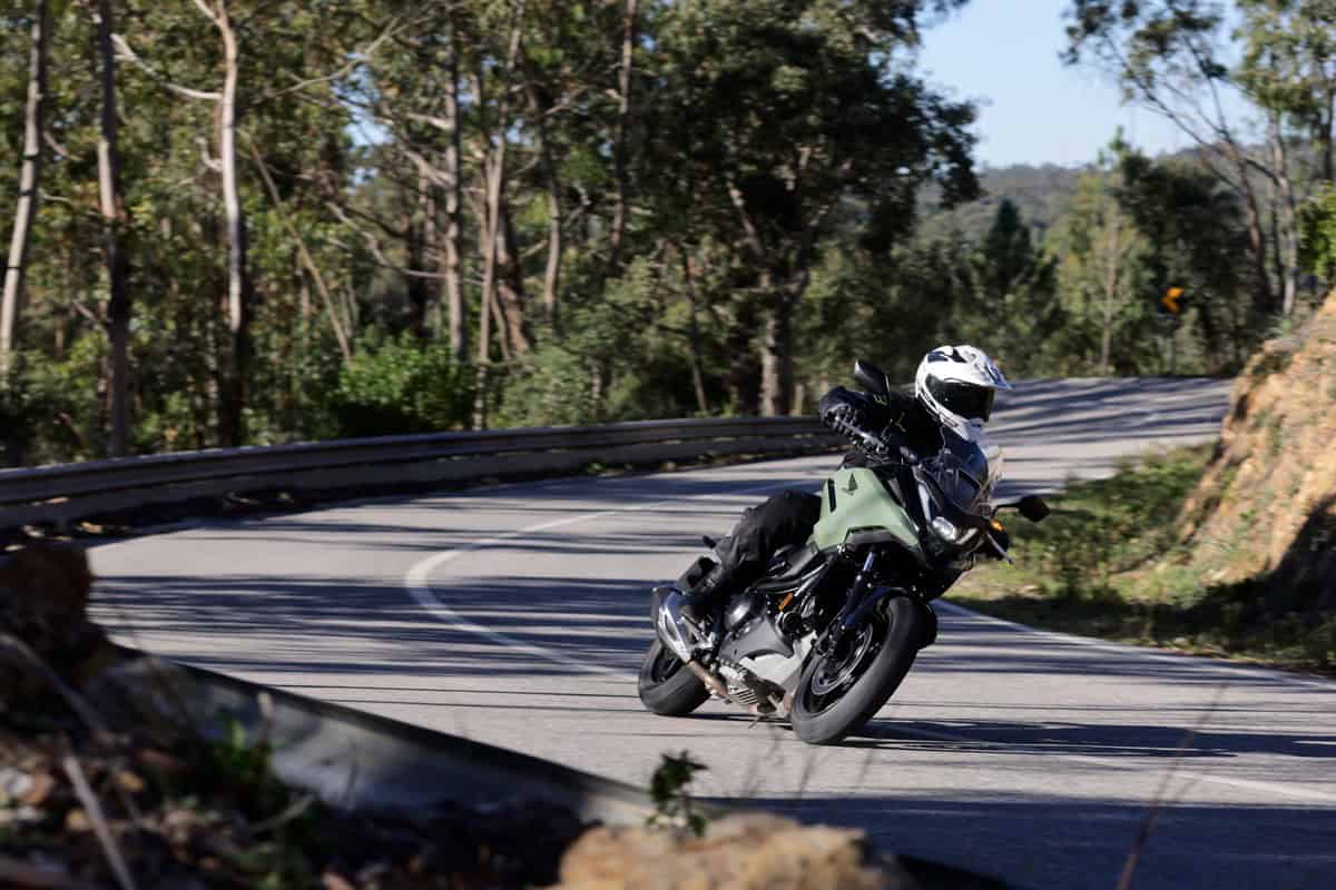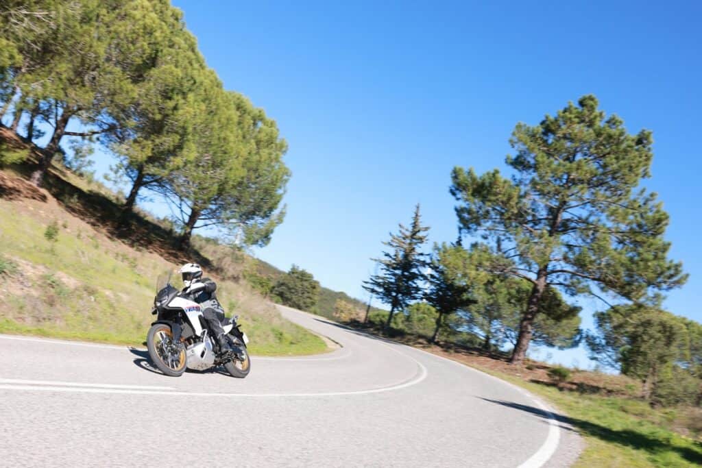 Het belooft vandaag een zonnige 18 graden te worden en daarom beginnen maar eens in Standard. Die achttien graden laten echter nog even op zich wachten, bij vertrek vanaf het hotel geeft de thermometer krap drie graden aan. De optionele handvatverwarming (€ 341,05) wordt daarom in grillstand 4 gezet en we kunnen op weg. Al na een paar rotondes dient het Algarve achterland zich aan, dat zich kenmerkt door fantastische natuur, nauwelijks verkeer en slechts sporadisch een klein dorpjes dat zich in het heuvellandschap heeft genesteld. Al na twee bochten weet je waarom de NC750X nog altijd zo hoog in de verkooplijsten staat. Het gaat allemaal zo gemakkelijk en zo vanzelfsprekend, dat je gevoelsmatig niet eens een rijbewijs nodig hebt om ‘m te kunnen rijden. De koppeling is met één vinger te bedienen, de zithouding ontspannen en perfect passend bij het beoogde inzetgebied, de Metzeler Tourance Next harmoniëren perfect met de motorfiets en de remmen zijn prima op hun taak berekend, zonder overweldigend te zijn. Waar de NC echter helemaal mee verrast in zijn enorme lichtvoetigheid, stabiliteit en stuurprecisie. De twin stuurt scherp in, volgt strak en stabiel de lijn en laat zich zowel makkelijk corrigeren als omleggen.