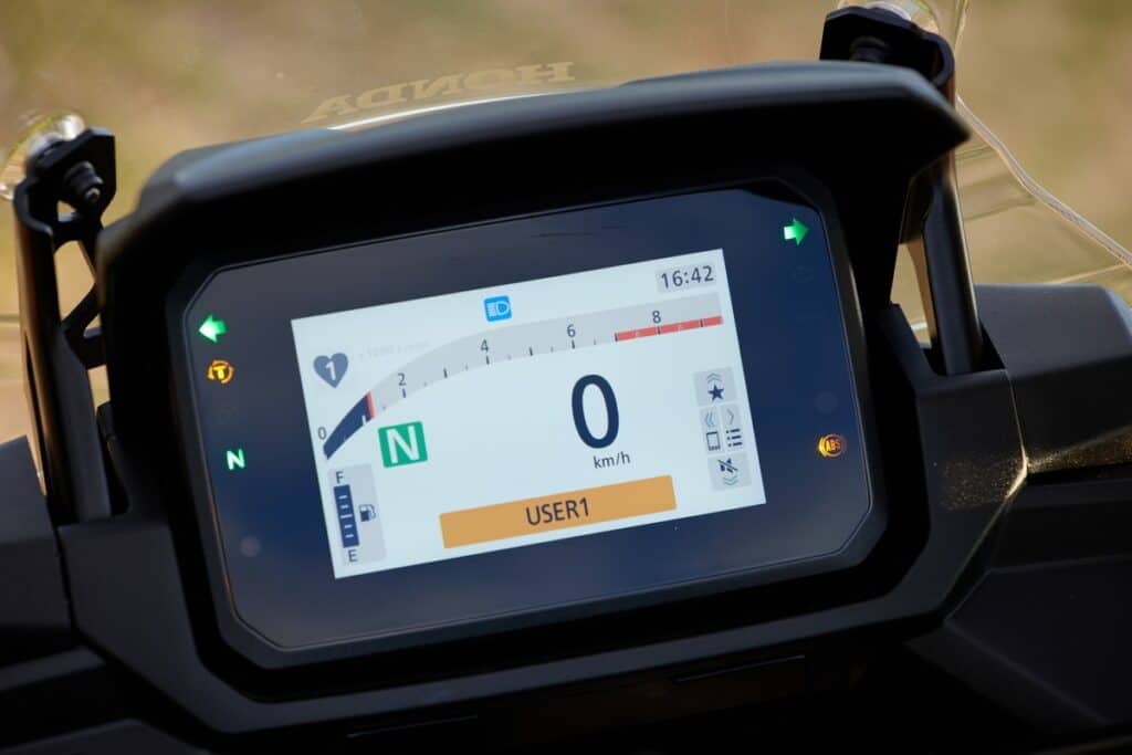 Een blok met een licht sportieve inborst kortom, wat je misschien niet direct bij een Transalp zou verwachten, maar het past ‘m wel. Het rijwielgedeelte laat zich namelijk met zijn aangepaste set-up ook relatief sportief aan de hand nemen, voelt beter in balans. Goed, want ook hier is er niets instelbaar, op de veervoorspanning achter na. Met een haaksleutel weer, wat gezien het reiskarakter waarbij er vaak bagage mee gaat, toch wel minimaal een hydraulische stelknop had mogen zijn. Met zijn 21 inch voor- en 18 inch achterwiel heeft de Japanner de focus natuurlijk voor naast het asfalt liggen, maar ook daarop slaat ‘ie een waanzinnig goed figuur. Is natuurlijk niet gezegend met het vederlichte voetenwerk van de met 17 inch wielen uitgeruste NC, maar kun je ‘m wel degelijk als lichtvoetig, stabiel en dynamisch bestempelen. Ondanks zijn grote voorwiel laat de Transalp zich heel intuïtief sturen, trefzeker ook en dat maakt dat ‘ie al vanaf de allereerste meter veel vertrouwen geeft. Zowel on- als offroad trouwens, al gebied de eerlijkheid wel te zeggen dat de vijf kilometer gravelpiste die we voor de wielen kregen, wel te weinig was om serieuze uitspraken over de offroadkwaliteiten van de Honda te doen.