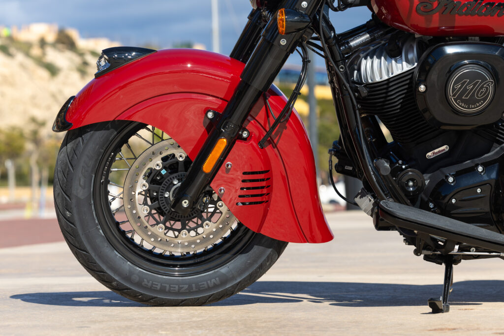 De Chief Vintage is verder behoorlijk goed geveerd en gedempt, wat met name achter een compliment verdiend gezien de korte veerweg van 75 millimeter. Ook kort op elkaar volgende hobbels worden in de regel nog verrassend goed geabsorbeerd, en dat is in het cruiser-segment zeker geen vanzelfsprekendheid. Dat combineert deze Indian met voor het genre eveneens prima remmen. De voorrem grijpt zeker niet fel aan en laat zich mooi gedoseerd doorremmen, maar bij motoren van dit kaliber is een achterrem die zijn mannetje staat ook geen overbodige luxe in de afdaling van een bergweg. Met 327 kilo komt er immers best wat gewicht achteraan als je voor een bocht die harder knijpt dan je dacht toch nog wat harder moeten ankeren en de voorrem al op de top van zijn kunnen zit. Aan de achterrem van de Chief Vintage heb je in dat geval een goede assistent, en ook het ABS regelt netjes af.