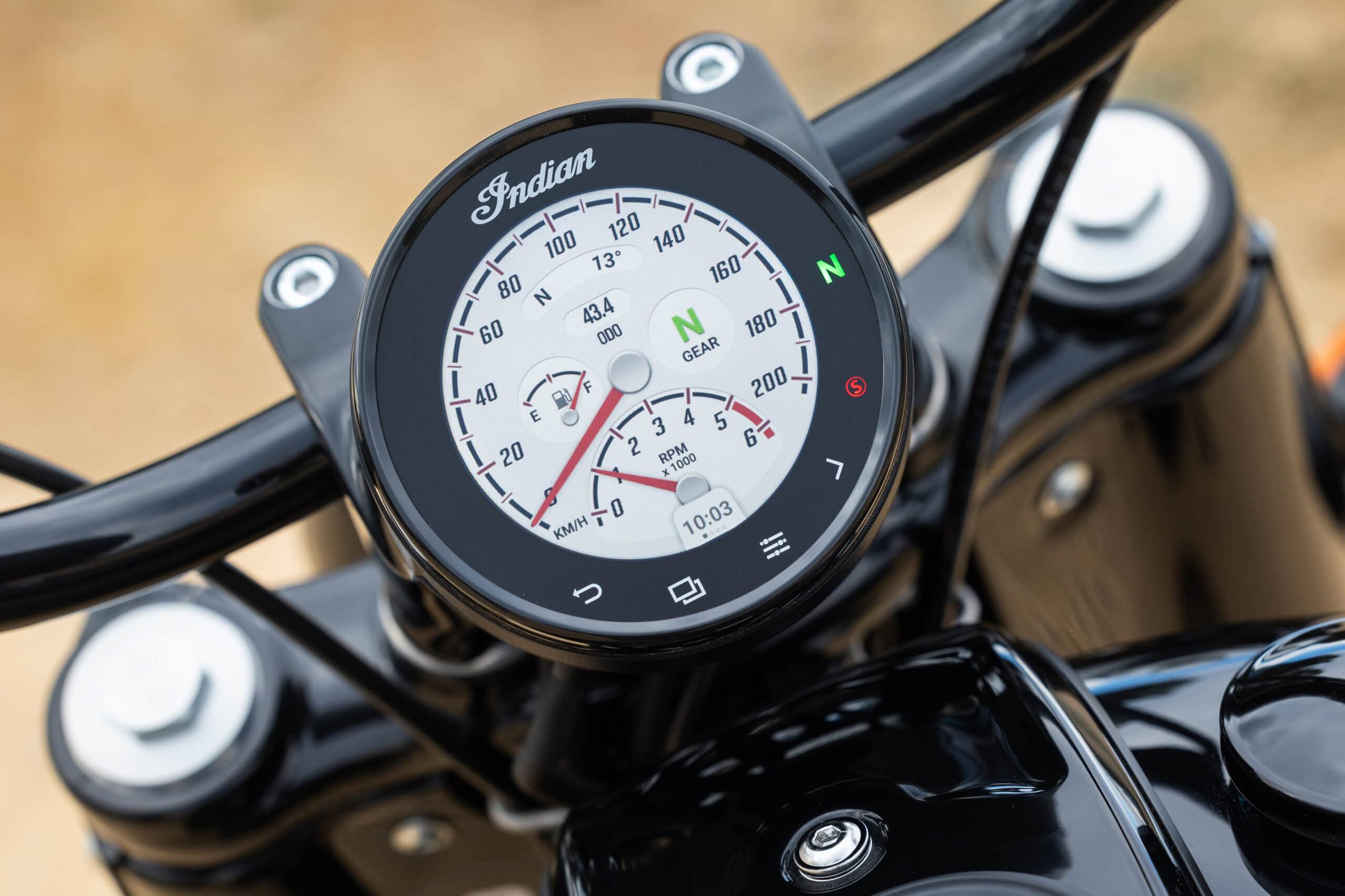 ‘Ouderwets’ de contactsleutel omdraaien, hoeft bij de Chief Vintage trouwens niet. Hij is voorzien van een zogeheten ‘keyless’-startsysteem, waarbij je de contactsleutel in je zak houdt. Het opstarten van het TFT-dashboard gaat weliswaar sneller dan bij voorgaande Chief-modellen, maar al met al zou het nog best wat vlotter mogen. Verder niets dan lof voor dit fraai uitgevoerde ronde scherm, dat is uitgevoerd als touchscreen. De menu’s open je snel en makkelijk met de tiptoetsen in de onderste rand van het scherm, waarna je alles rechtstreeks kunt selecteren. En dat kan allemaal met de handschoenen aan. Je hoeft dus niet langer je weg te vinden in allerlei knoppen op het stuur, al zitten die er overigens gewoon ook op, dus je hebt de keuze. Daarbij kun je in principe alles vanaf de linkerkant van het stuur doen, maar er is ook nog een handig scroll- en enterknopje op de achterkant van de rechter-schakelaarunit. Een bijzonder geslaagd geheel, dat een klassiek uiterlijk combineert met de moderne functionaliteiten als verschillende weergaveopties, een infotainment-systeem en navigatieweergave.
