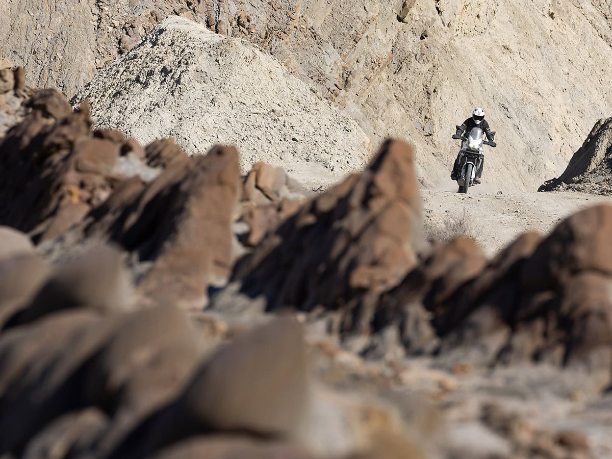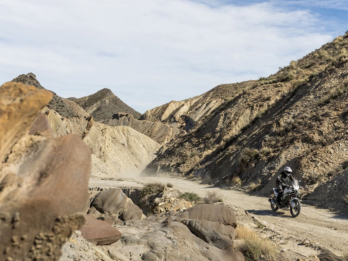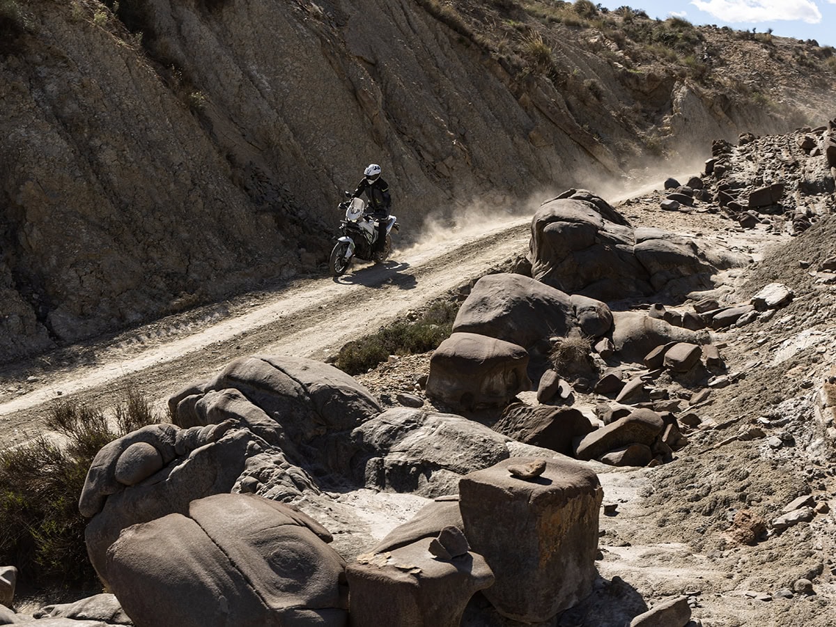 Op de offroad gedeeltes toont de Japanner vergelijkbare kwaliteiten als op de weg. De staande ergonomie is gewoon weer erg goed en ook naast het asfalt laat de twin die zich heel makkelijk aan de hand nemen. Voelt minder zwaar dan ‘ie eigenlijk is en maakt vooral duidelijk dat als je in de markt bent voor een KLE, je jezelf dit soort geneugten echt niet moet ontzeggen. Mochten kopers al offroad gaan met de twin, dan blijft het vermoedelijk vooral bij goed begaanbare gravelpistes, maar ook op de deels meer extreme stukken in de Tabernas woestijn, die vooral gekenmerkt worden door stevige rotspartijen, weert de KLE zich kranig, ondanks dat de vering hier met zijn veerwegen van 210 mm voor en 196 millimeter achter soms wel echt aan zijn grenzen komt. Maar dat ‘ie het überhaupt kan, is al lovenswaardig.