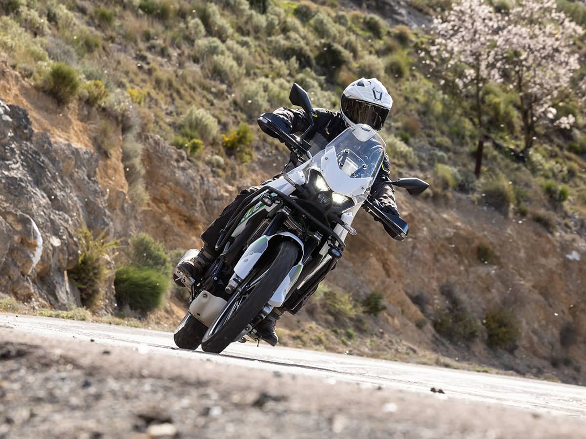 Of de nieuwe KLE de best wel hoge verwachtingen waarmaakt, gaan we proefondervindelijk vaststellen rond het prachtige achterland van het Spaanse Almeria, waar een hele batterij SE’s klaar staat voor de eerste kennismaking. Deels standaard, deels aangekleed met wat extra opties als valbeugels, mistlampen en/of een Akrapovic-einddemper. Extra’s trouwens die de machine bijzonder goed staan en het avontuurlijke karakter nog dikker onderstrepen. Ook prettig, het testbataljon is unaniem gehuld in de witte kleurstelling, wat, toeval of niet, veruit mijn favoriet is.