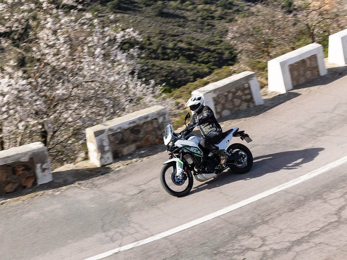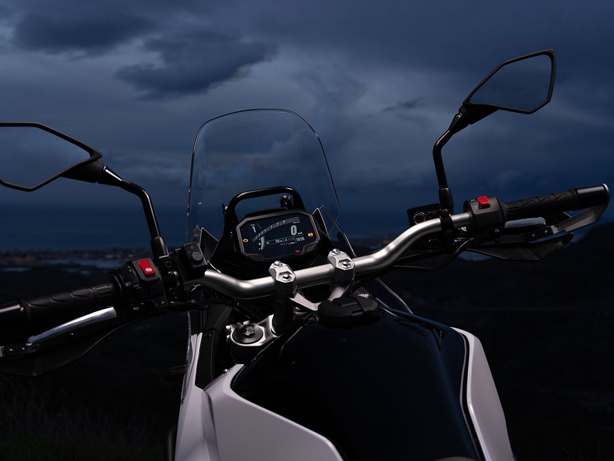 Die prijs heeft dan wel betrekking op de basisversie, daarnaast is er echter ook, zoals inmiddels redelijk gangbaar bij de groenen, nog een wat rijker aangeklede SE-variant. In dit specifieke geval vertalen de letters SE zich in een grotere, zeer goed beschermende ruit (voor de kommafetisjisten: 106 mm groter), met metaal versterkte handkappen, aluminium carterbeschermer, led-knipperlichten, wat exclusievere kleurstellingen én een 4,3 inch TFT scherm met connecticity. De basisvariant bedient zich van een LCD-scherm, die overigens ook connectivity ondersteuning biedt. Zowel de basis- als SE-versie is er in verschillende andere aangeklede varianten: de Rally is verrijkt met onder meer Akrapovic-einddemper, lager rallyzadel en grotere carterbeschermer, de Adventure Tourer met onder meer valbeugels en zijkoffers. En dan is er als laatste nog de Top Case-uitvoering, die zich in de schijnwerper rijdt met een USB-C-aansluiting en een, en dit verwacht je écht niet, een topkoffer…