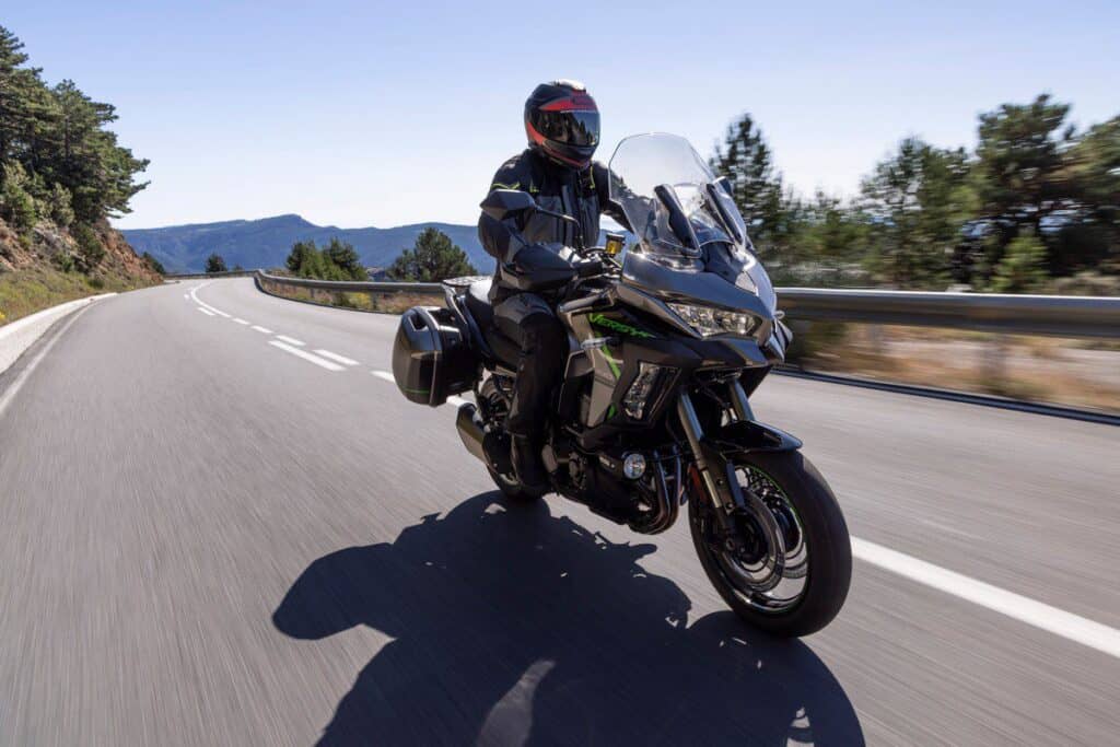 Voor de eerste kilometers lijkt de gulden middenweg, de Road-stand, wel passend. Blijkt een goede keuze, vanaf het hotel onder de rook van het plaatsje Navarcles, gaat het eerst via brede wegen en uiteindelijk de snelweg omhoog richting de uitlopers van de Pyreneeën. De eerste meters zijn direct een feest der herkenning: zeer comfortabele, toeristisch georiënteerde ergonomie en een zoevende vier-in-lijn turbine in het vooronder. Een Euro5+-update heeft de potentie om een blok compleet van alle fut te castreren, maar dat heeft Kawasaki zeer efficiënt weten te omzeilen met alle aanpassingen. De kracht van de 1100 vanuit de toerentalkelder is als vanouds imponerend. Bizar hoe makkelijk en krachtig de rijklaar toch 259 kilo wegende toermachine van de plaats komt. Alsof er een dikke scheepsdiesel aan boord is, maar dan wel eentje met uiterst verfijnde manieren. De gasaanname is fluweel zacht en de vermogensontplooiing lekker lineair en voorspelbaar, waarbij de nieuwe 1100 onderin gevoelsmatig niet heel veel meer spierballen heeft dan de huidige 1000. Ook zijn er nog altijd lichte trillingen bij pak ‘m beet 6.500 toeren, maar die melden zich maar in een heel kort bereik en zijn bovendien zeker niet al te overweldigend. Je moet al constant 170 km/uur in z’n zes rijden, wil je er blijvend aan blootgesteld worden, wat natuurlijk nooit gebeurd. Al was het alleen al omdat dat hier ten lande een tikkie buiten de wettelijke kaders valt. Hij zou het overigens wel makkelijk kunnen, blijkt op de snelweg, want de ruit doet zelfs in de laagste stand opvallend goed zijn werk. In combinatie met de prima functionerende cruise-controle en de vering die elk plooitje uiterst comfortabel wegslikt, rammel je de snelwegkilometers richting de (ongetwijfeld bergachtige) bestemming er in no-time door!