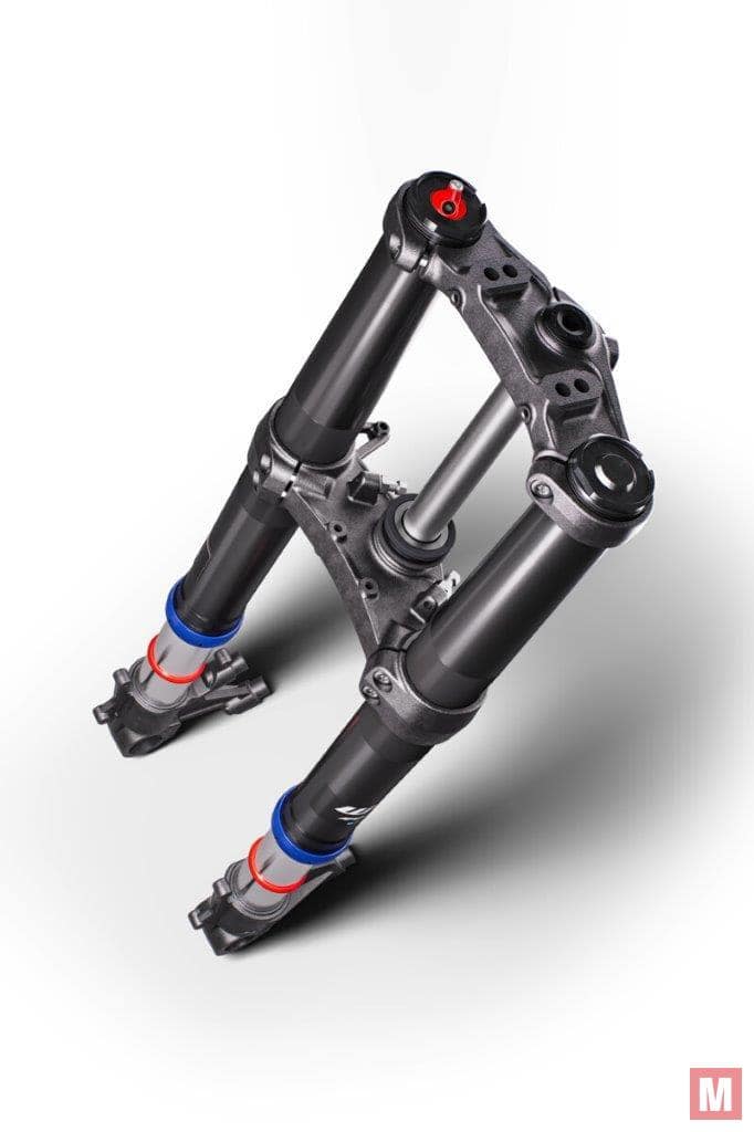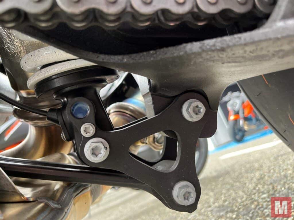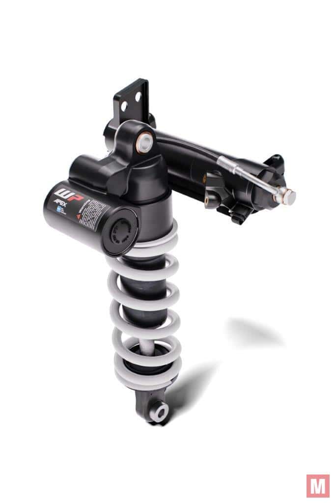 Achter die blauwe stip bevindt zich de sensor onder in de WP Apex semi-active schokdemper, die drie sensoren vervangt.